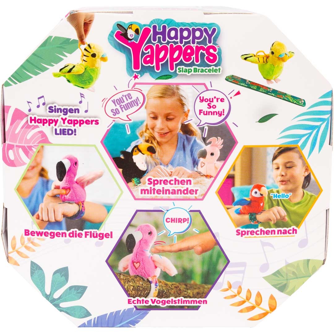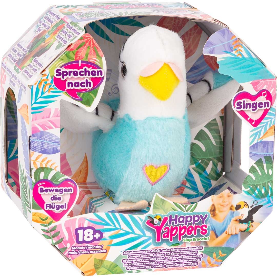 Die Happy Yappers bringen Leben ins Kinderzimmer! Diese niedlichen, interaktiven Plüschvögel wiederholen deine Worte mit einer lustigen, piepsigen Stimme, singen ihr fröhliches Lied („Rockin’ Robin“) und schlagen dabei begeistert mit ihren Flügeln.