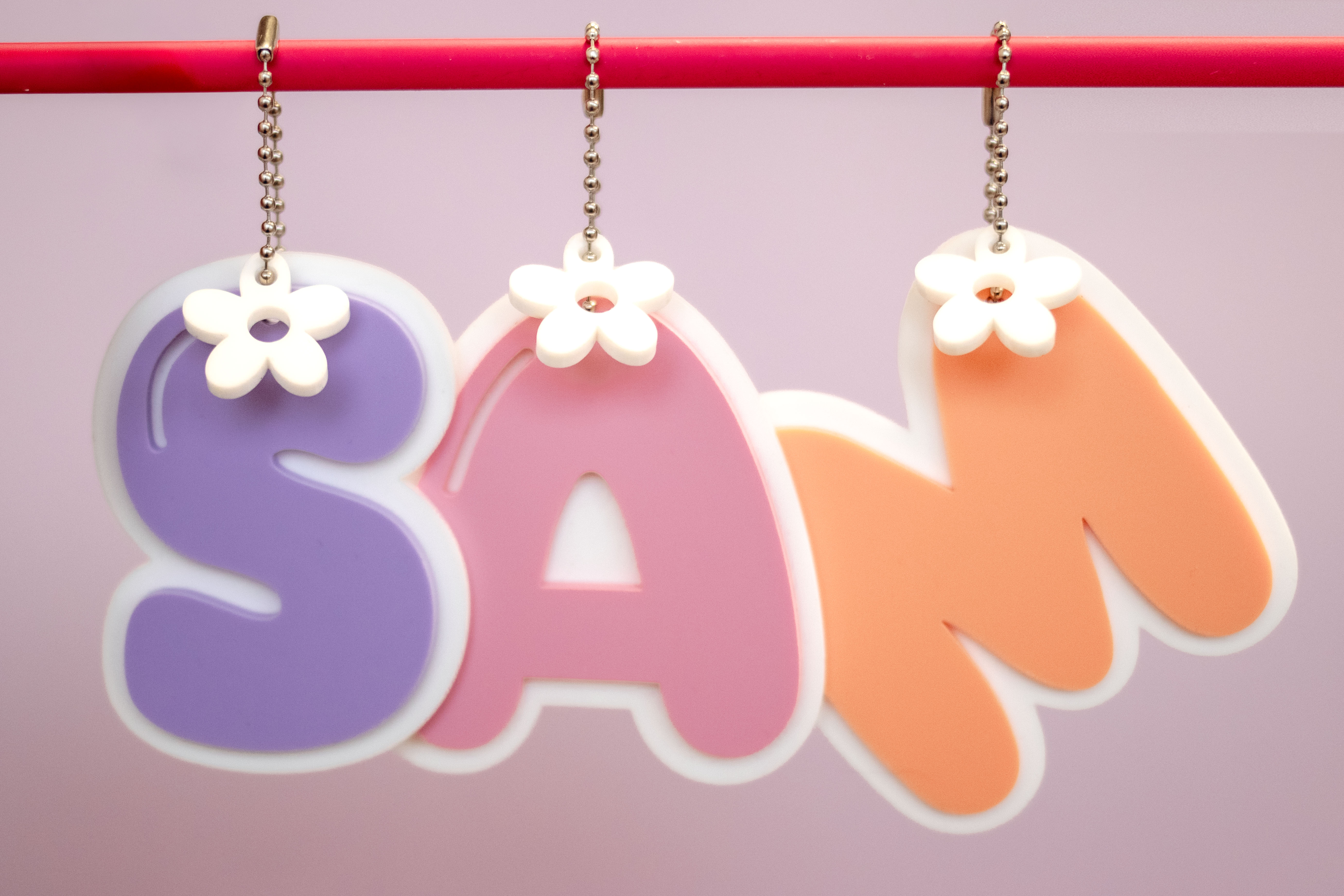 Design: Großer Buchstabe in Comic-Schrift mit weißem Blümchen-Charm