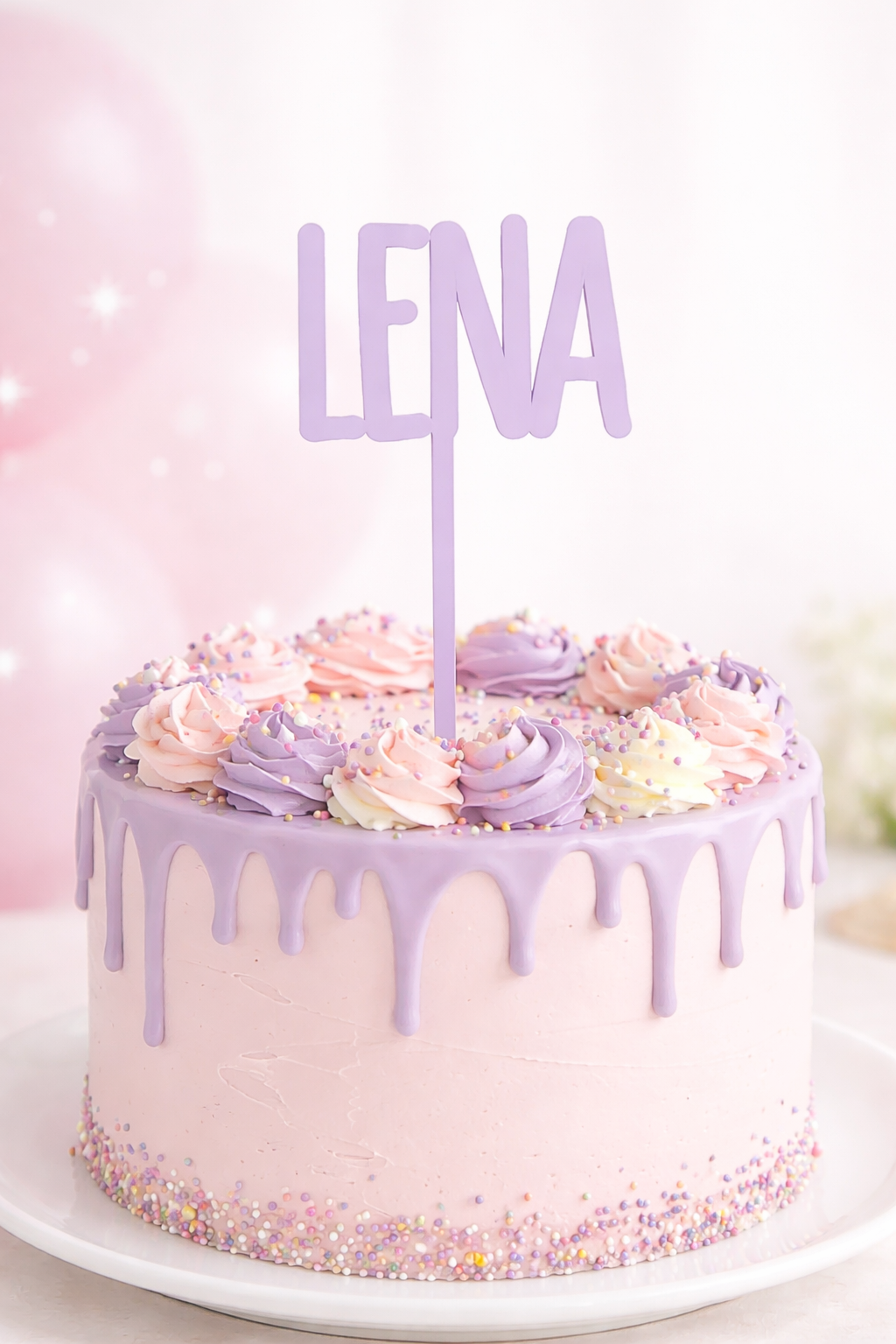 Individueller Cake Topper mit Wunschname für Geburtstage und besondere Anlässe. Der Name wird präzise aus Acryl oder Holz gefertigt und verleiht Kuchen und Torten eine persönliche Note. Durch das zeitlose Design passt der Topper zu Feiern für Kinder und Erwachsene gleichermaßen.