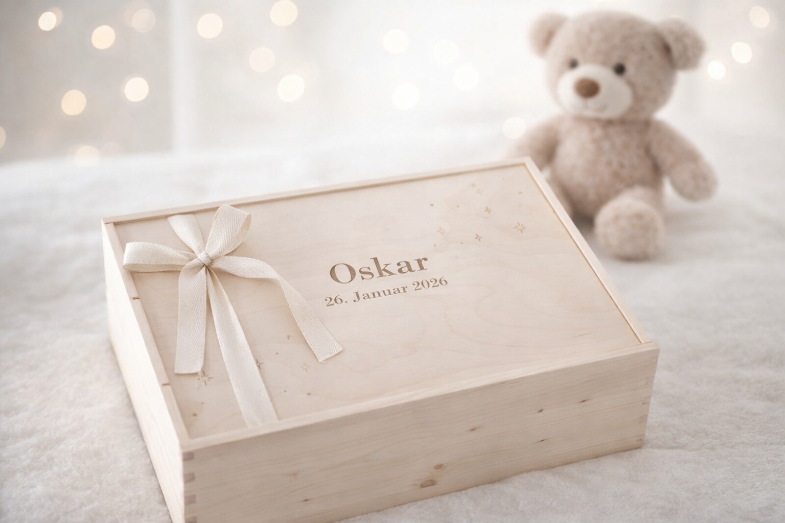 In der Box finden wertvolle Erinnerungen wie die ersten Schuhe, die Geburtskarte oder kleine Lieblingsstücke ihren festen Platz – sicher aufbewahrt und jederzeit griffbereit.
