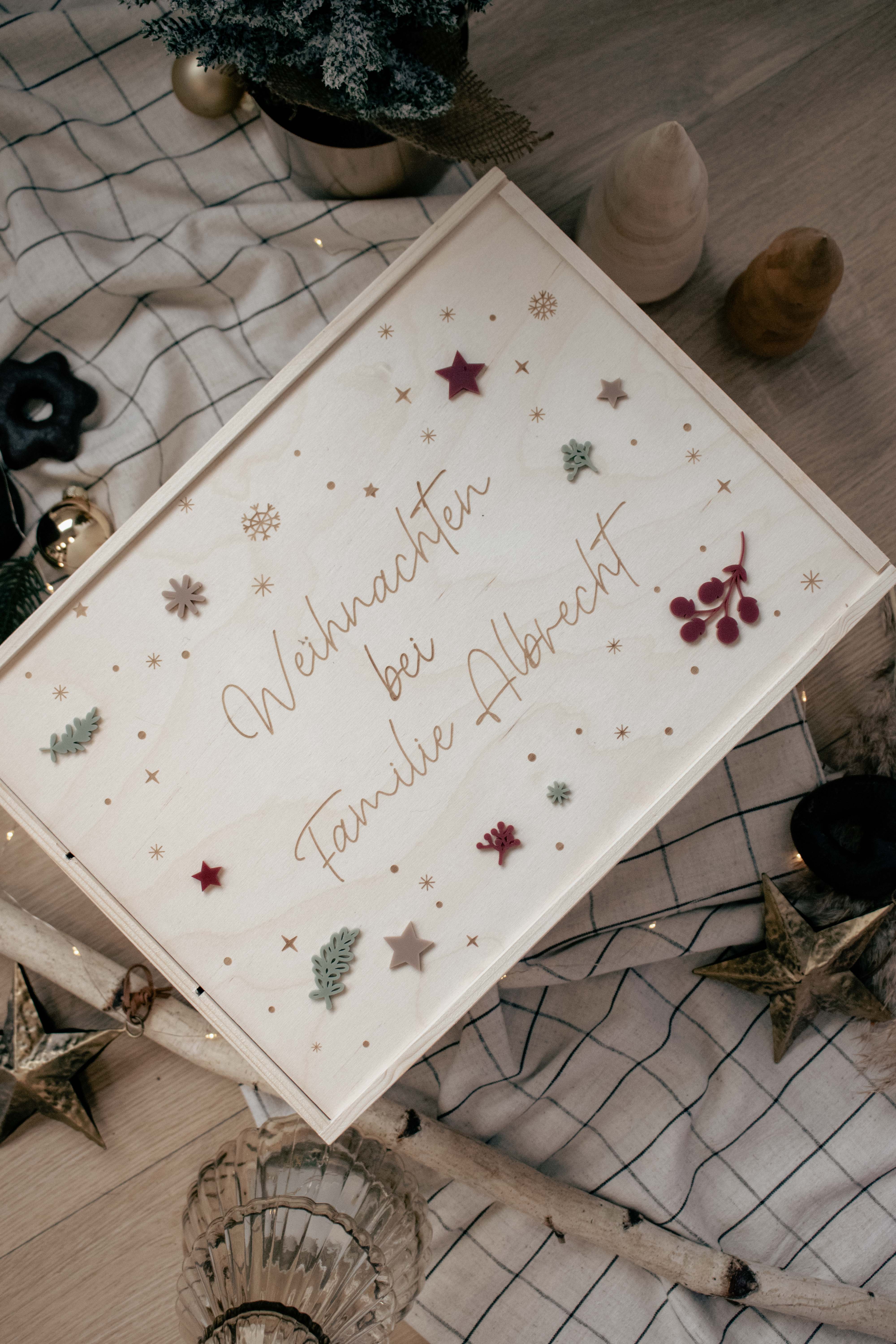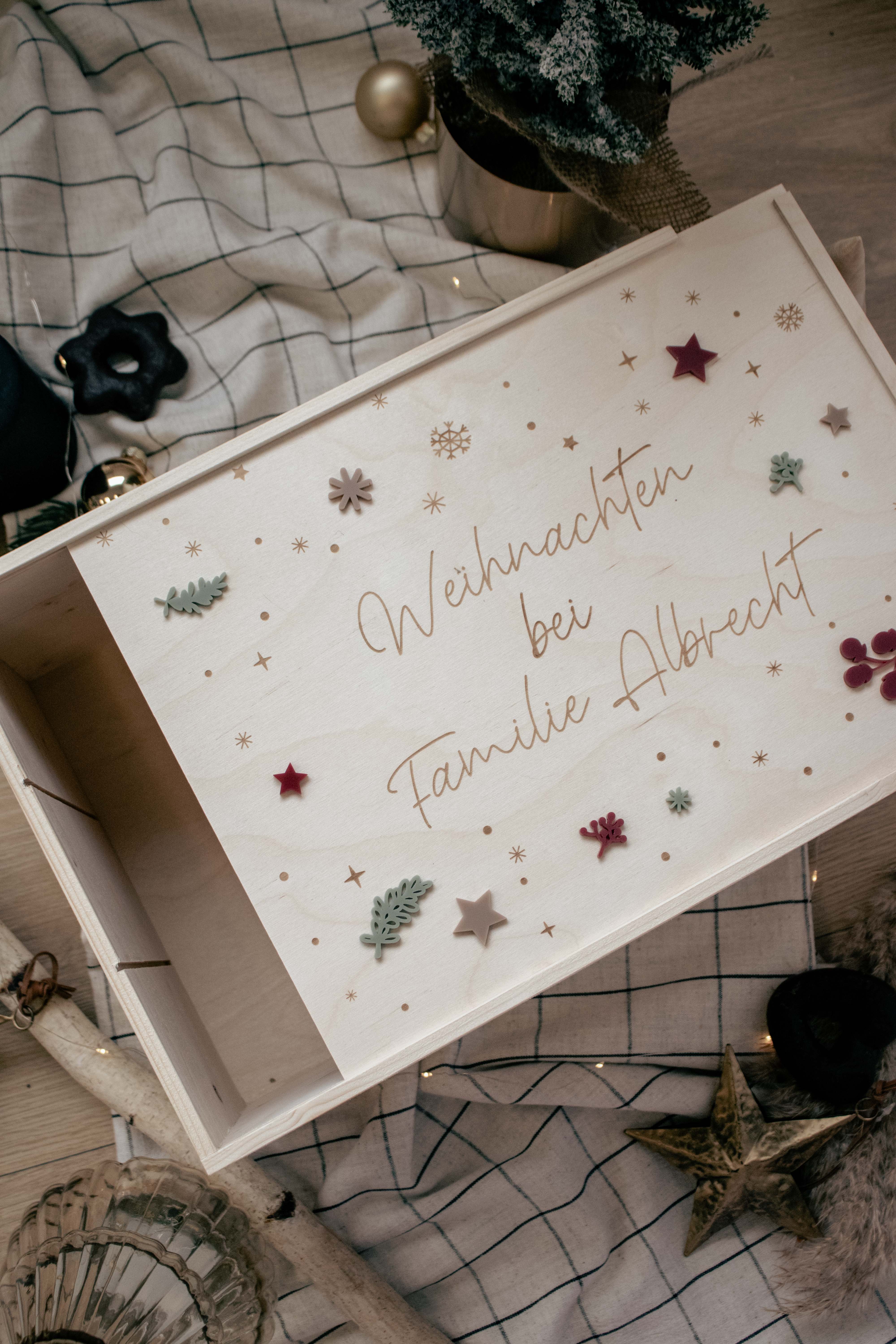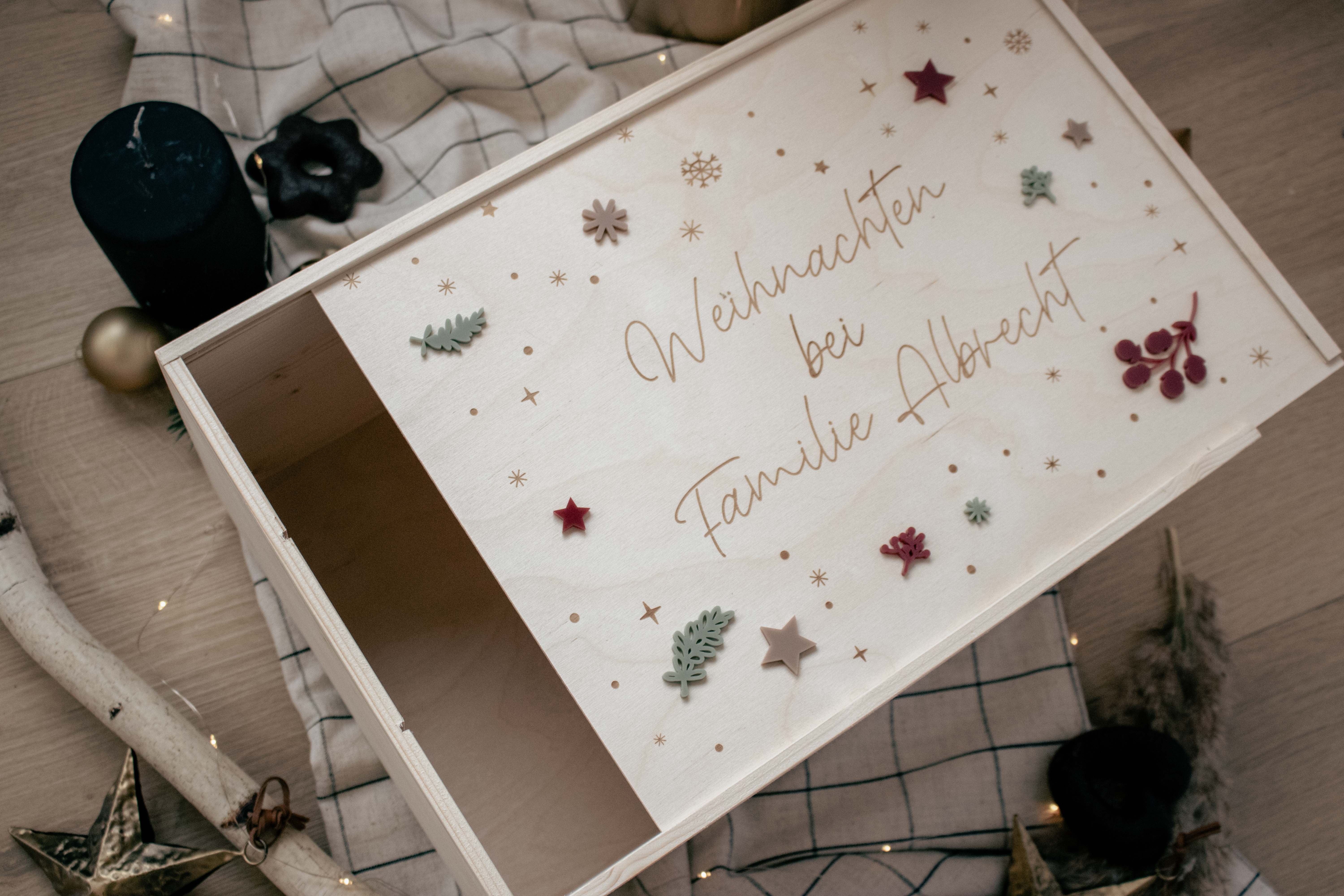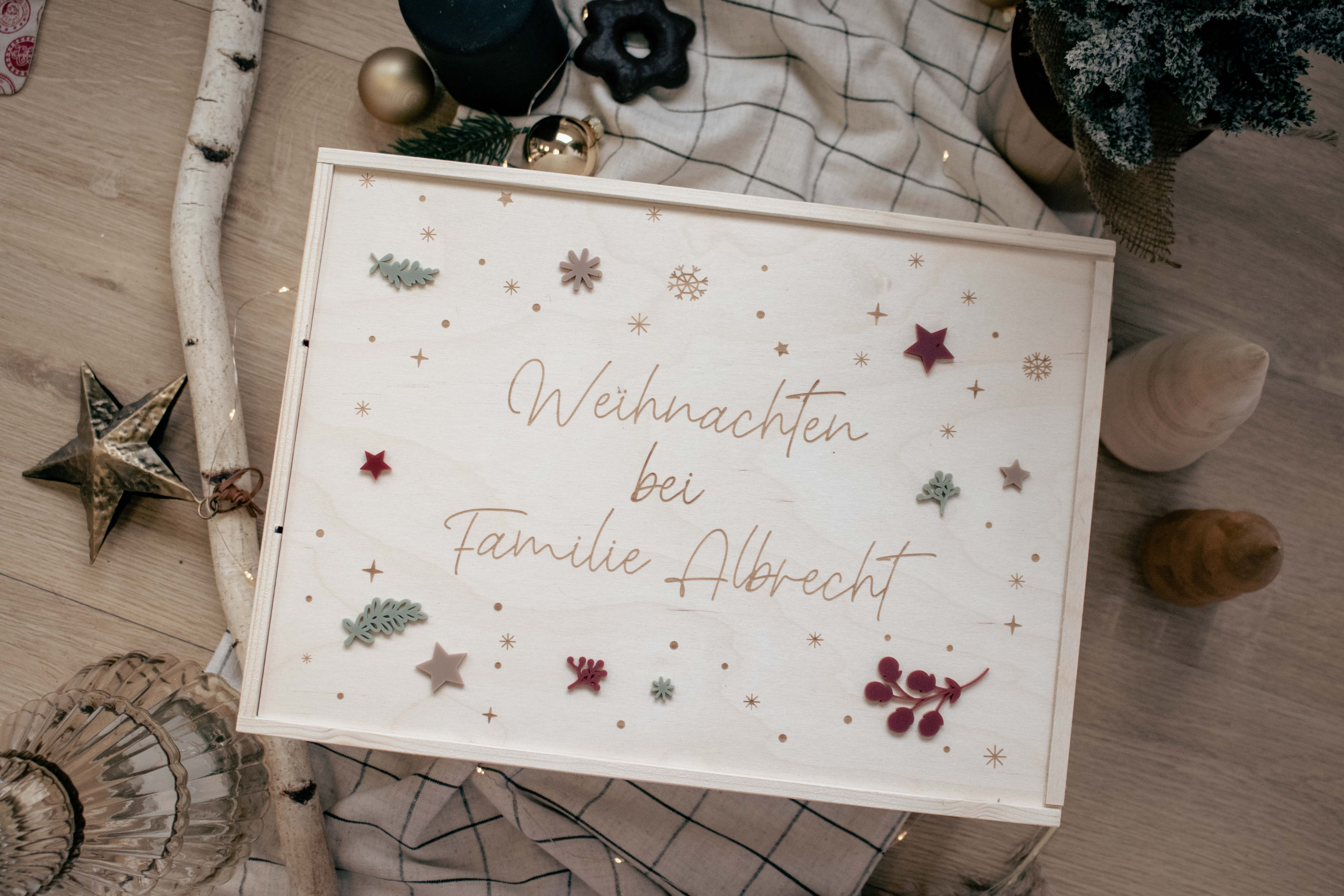 Bewahre deine liebsten Weihnachtsmomente und Traditionen stilvoll auf! Die Erinnerungskiste „Weihnachten bei Familie…“ von Invy Design ist aus hochwertigem Holz gefertigt und mit liebevoll graviertem Schriftzug versehen. Acrylverzierungen verleihen der Box einen festlichen Glanz und machen sie zu einem besonderen Aufbewahrungsort für Fotos, kleine Geschenke, Karten oder selbstgebastelte Erinnerungen. Perfekt, um die schönsten Familienmomente Jahr für Jahr wieder aufleben zu lassen.