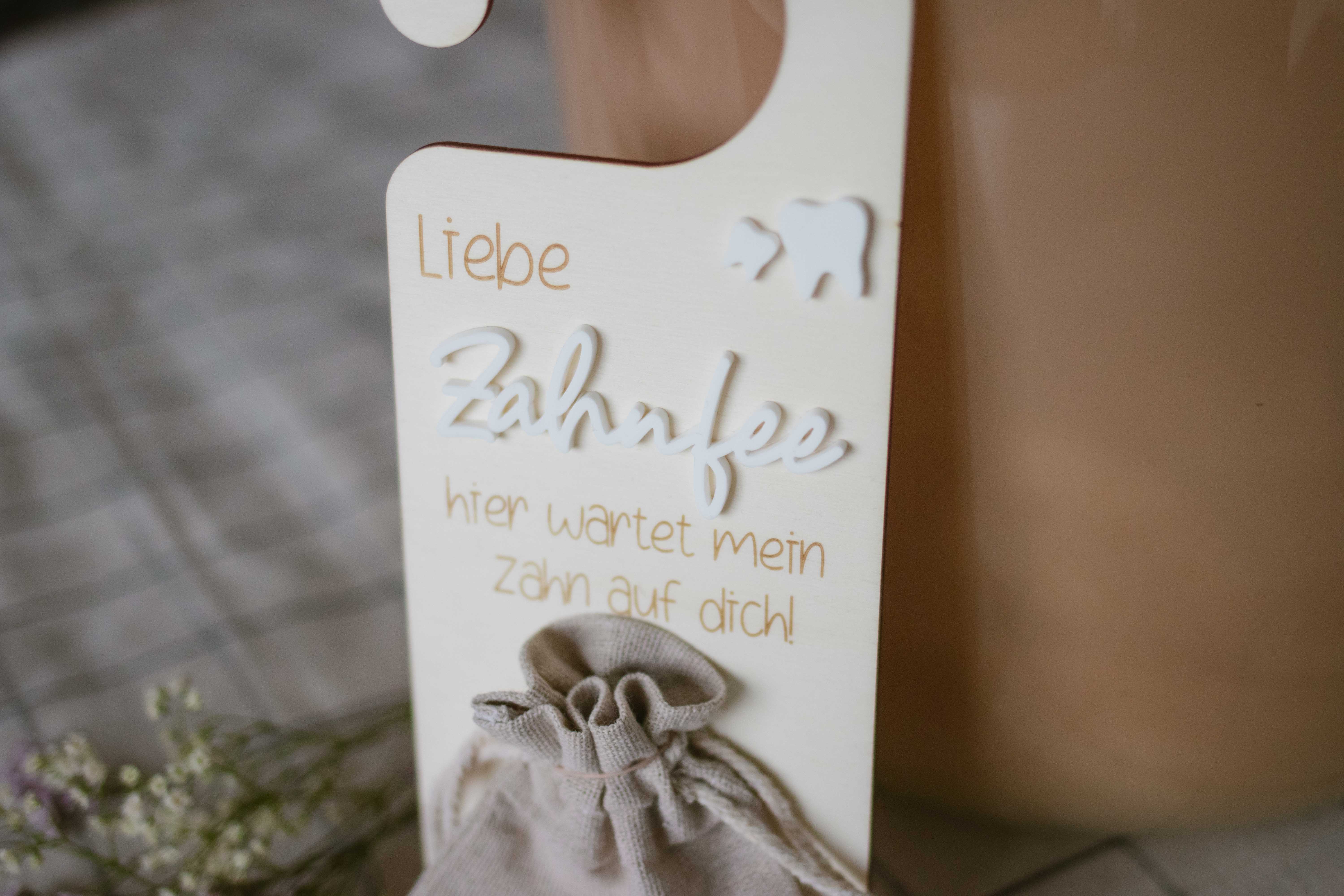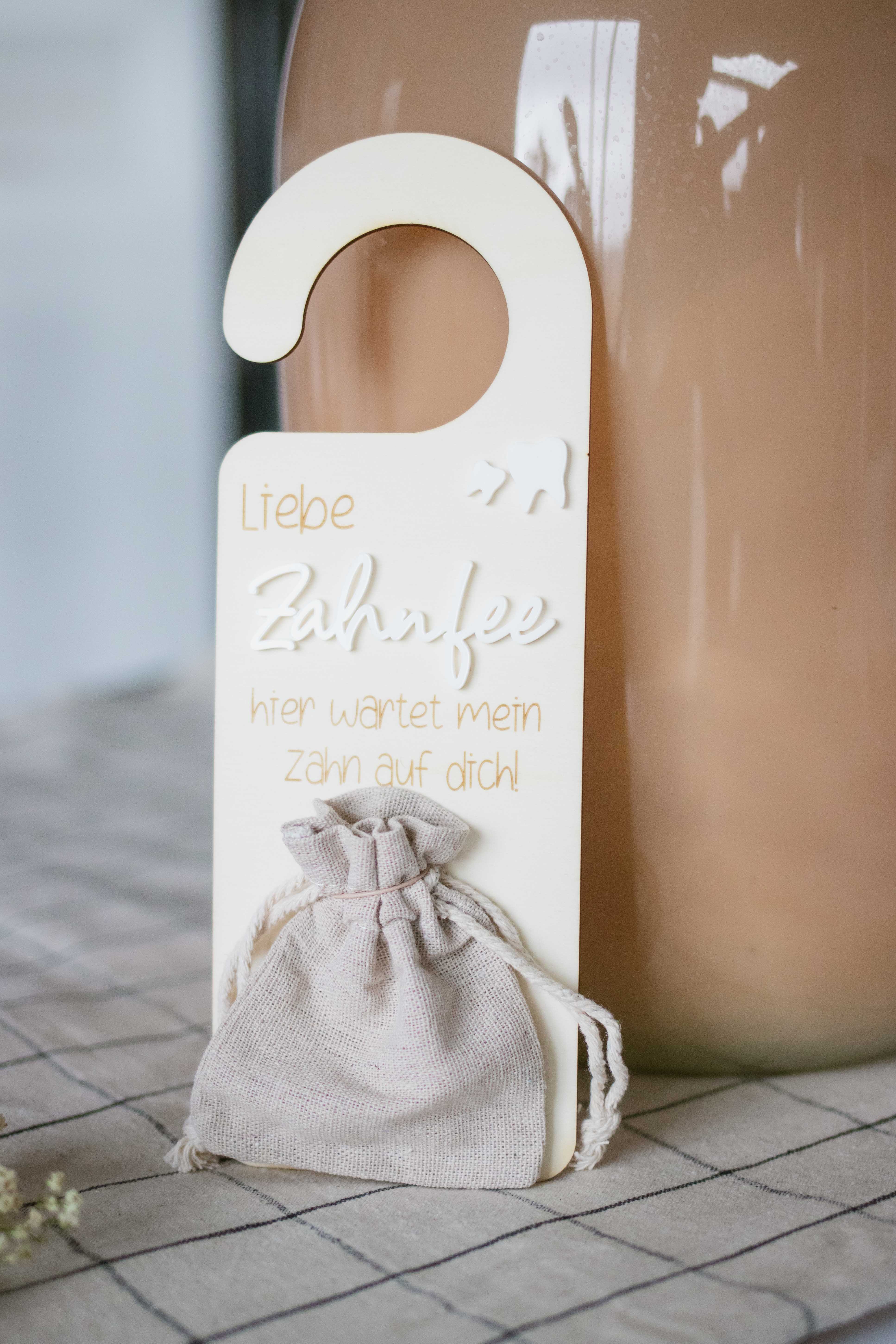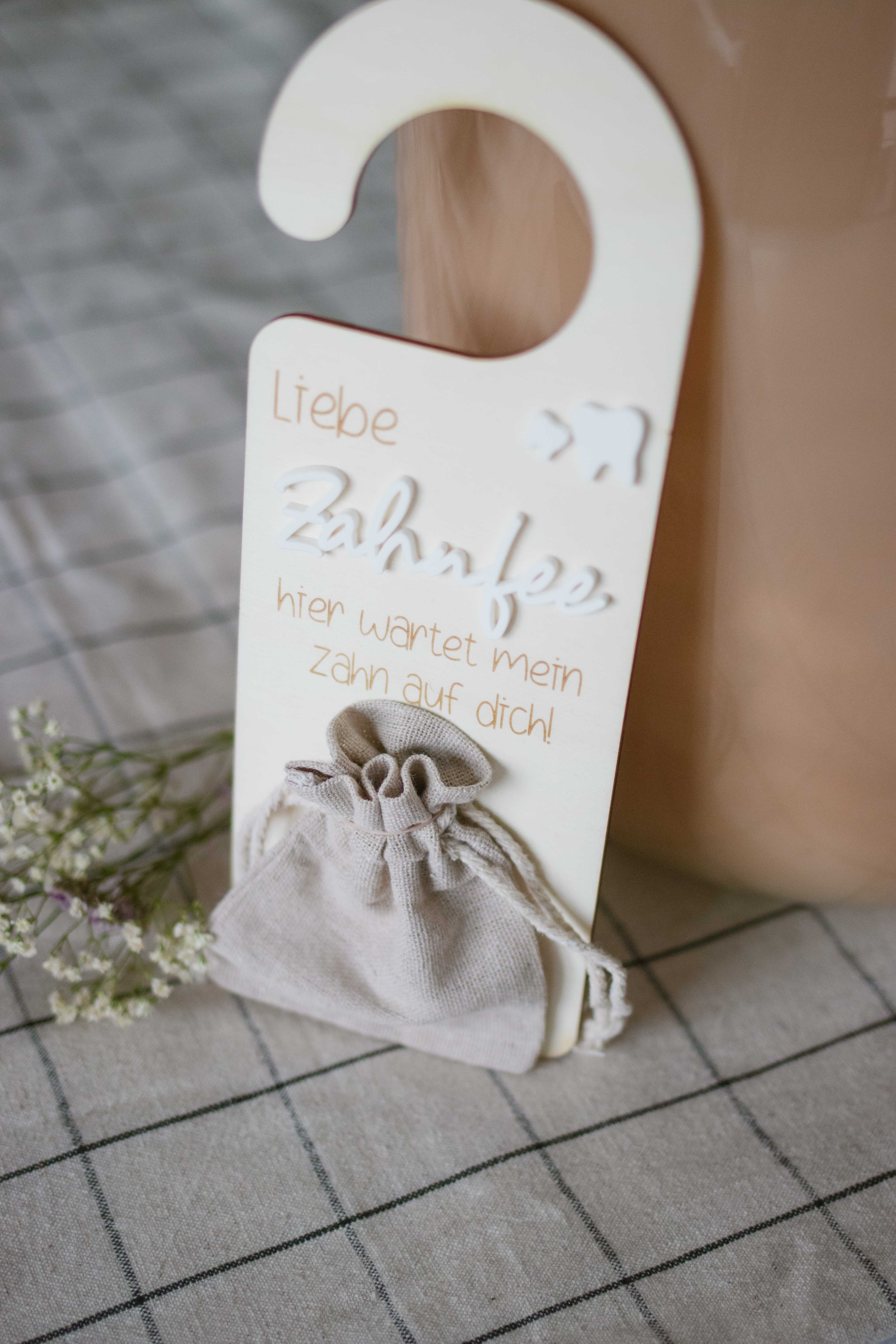 Mit dem liebevollen Spruch und dem niedlichen Leinensäckchen unten am Schild wird der Besuch der Zahnfee zu einem echten Highlight. Aber das ist noch nicht alles! Dieses Türschild bietet auch eine praktische Lösung, um den verlorenen Zahn sicher aufzubewahren, bis die Zahnfee kommt. Das Leinensäckchen unten am Schild ist perfekt, um den Zahn hineinzulegen und darauf zu warten, dass die Zahnfee ihn gegen etwas Besonderes eintauscht.