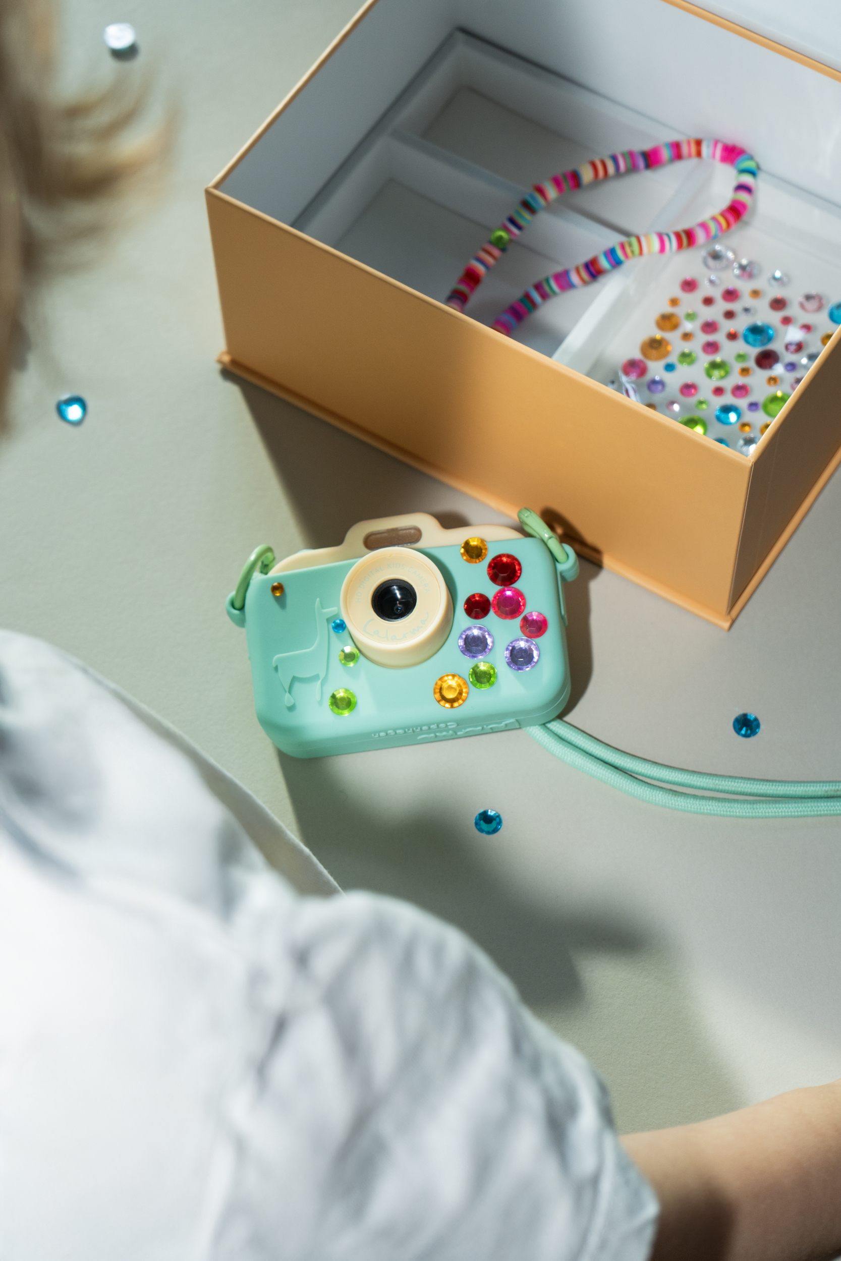 Im Set enthalten sind eine passende Schmuckschatulle, eine Perlen-Trageschlaufe und ein Bogen mit funkelnden Stickern, damit Kinder ihre Kamera ganz individuell gestalten können. Das weiche Silikoncase in Mint liegt angenehm in der Hand und sorgt für Schutz beim Spielen und Entdecken.