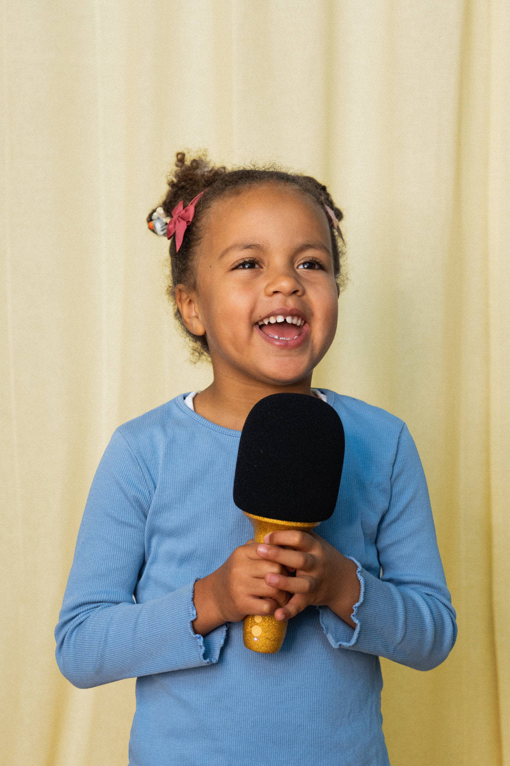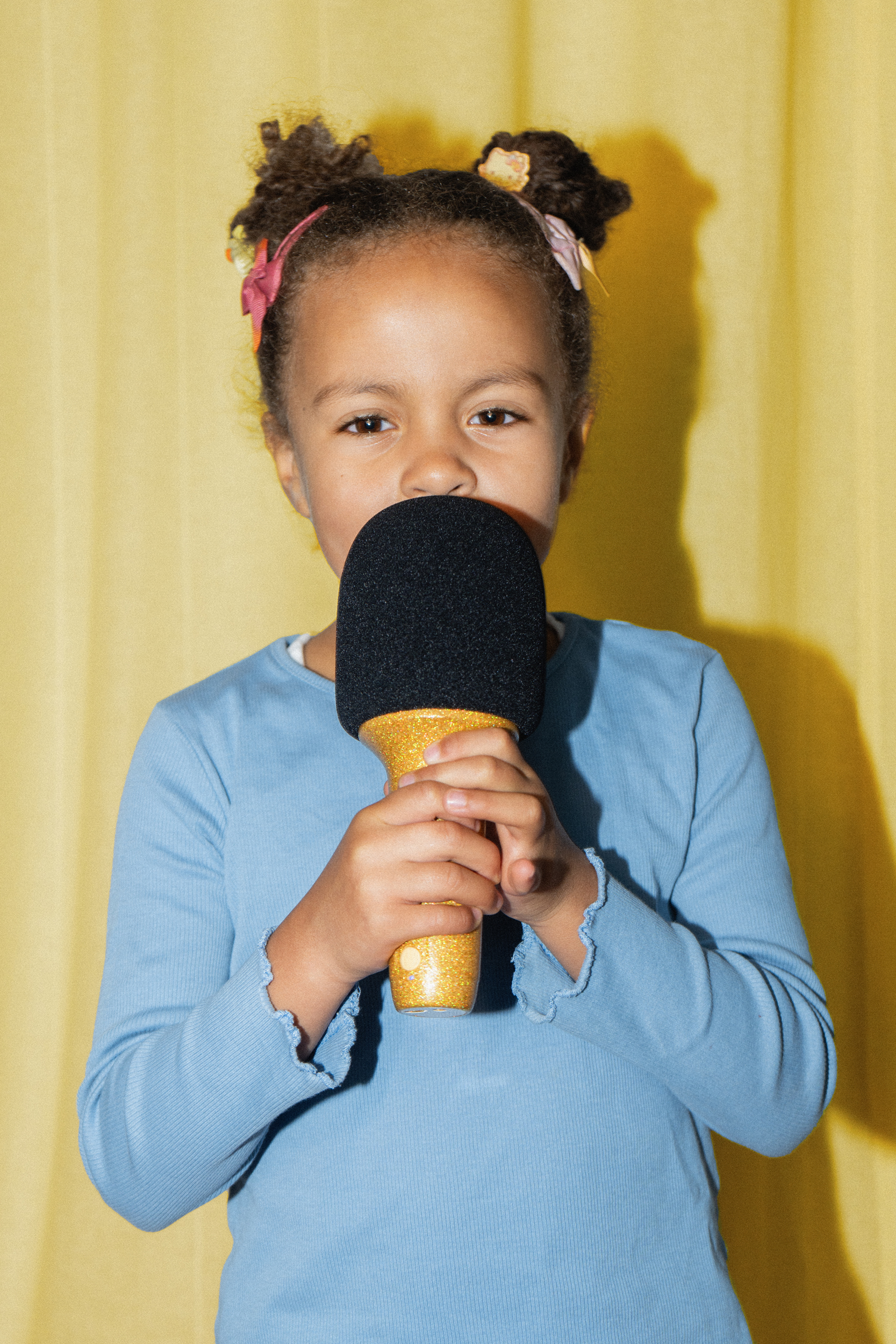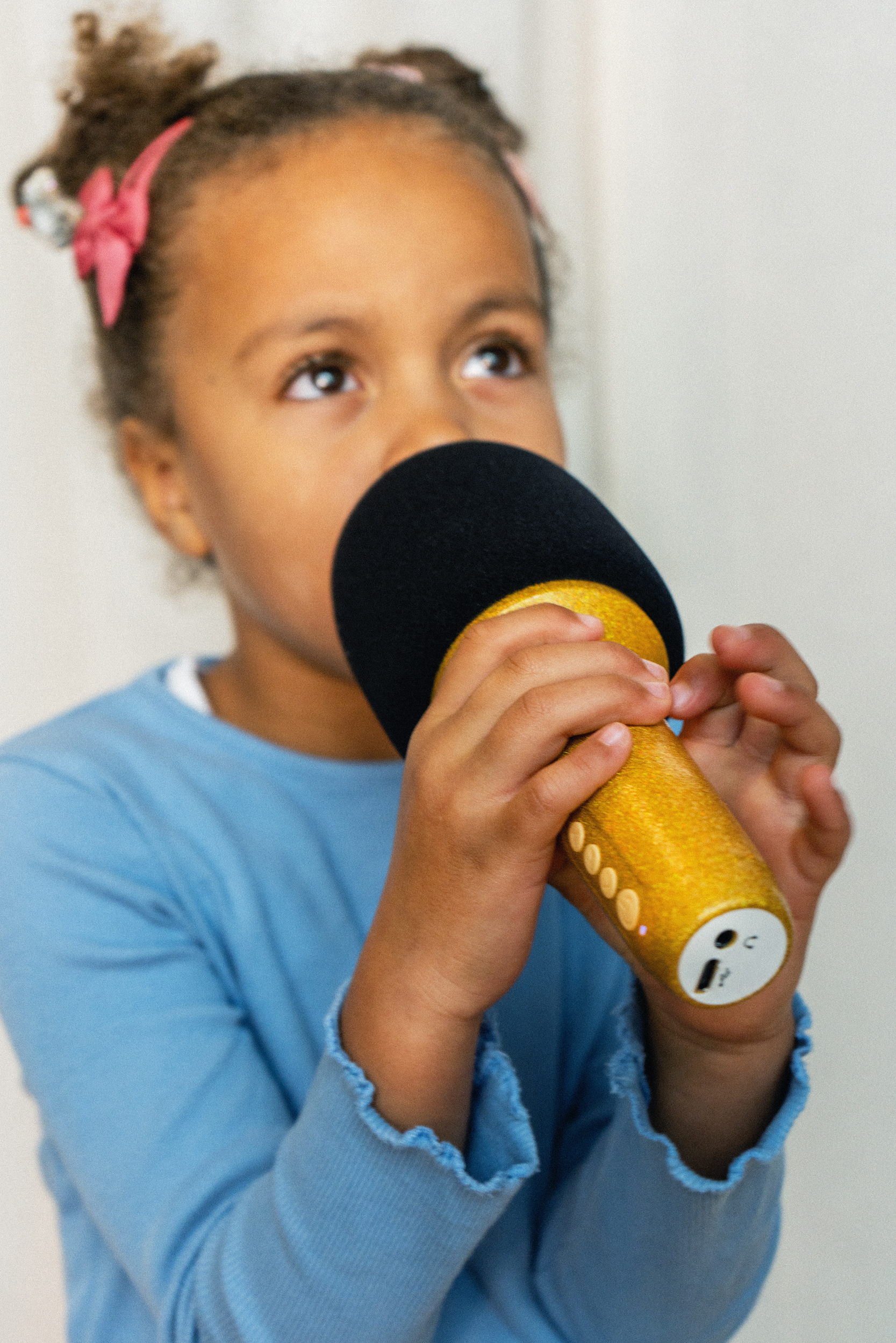 Starte deine eigene Show mit dem Lalarma Glitter Groove Bluetooth Mikrofon! Das kabellose Mikrofon im funkelnden Glitzer-Design sorgt für Auftritte voller Spaß und Energie. Dank magischer Soundeffekte, einstellbarem Hall und origineller Klangunterdrückung kannst du deine Stimme kreativ gestalten und jeden Auftritt einzigartig machen.