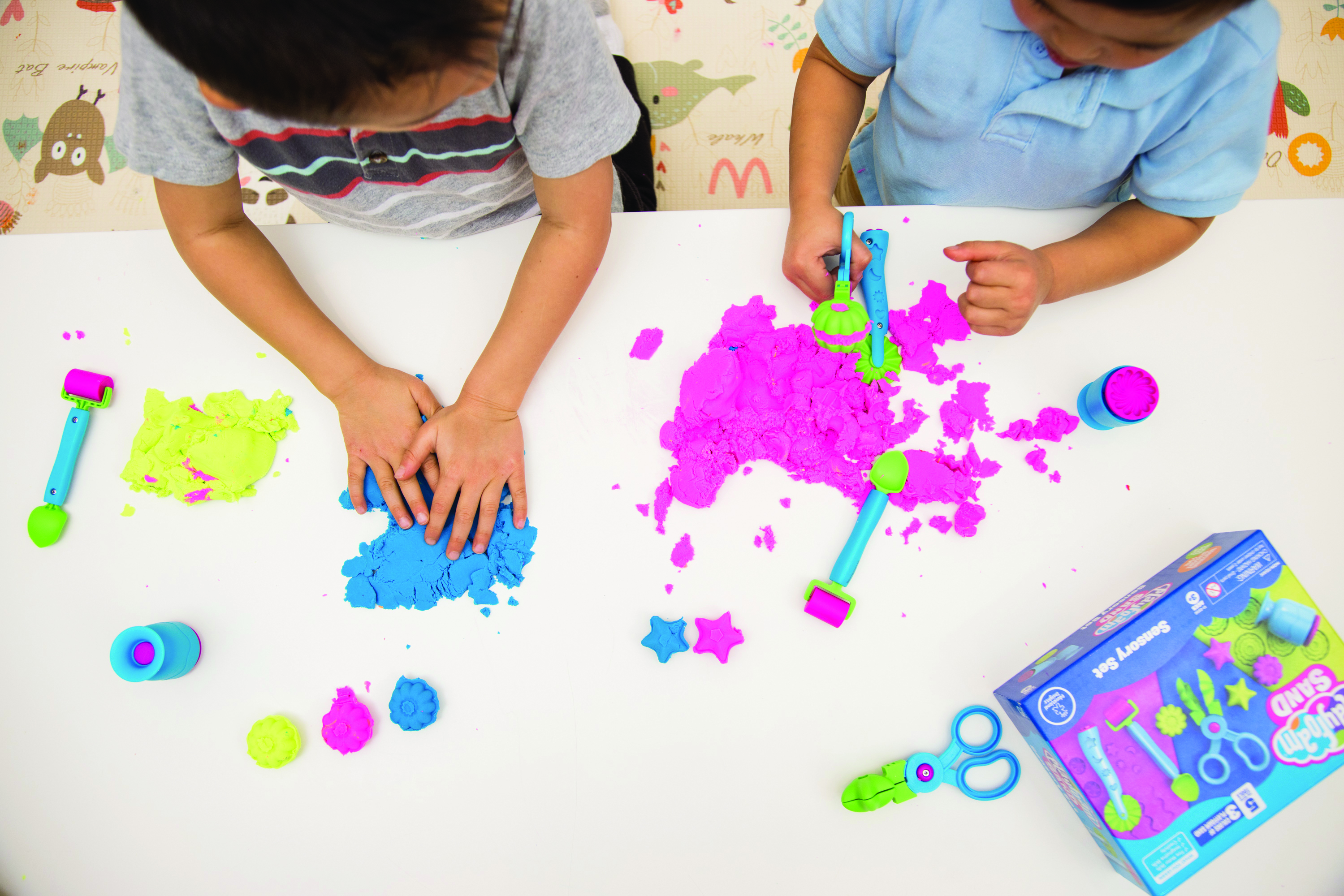 Der ungiftige Playfoam Sand trocknet nicht aus – so bleiben Spielspaß und Lernmöglichkeiten dauerhaft erhalten.