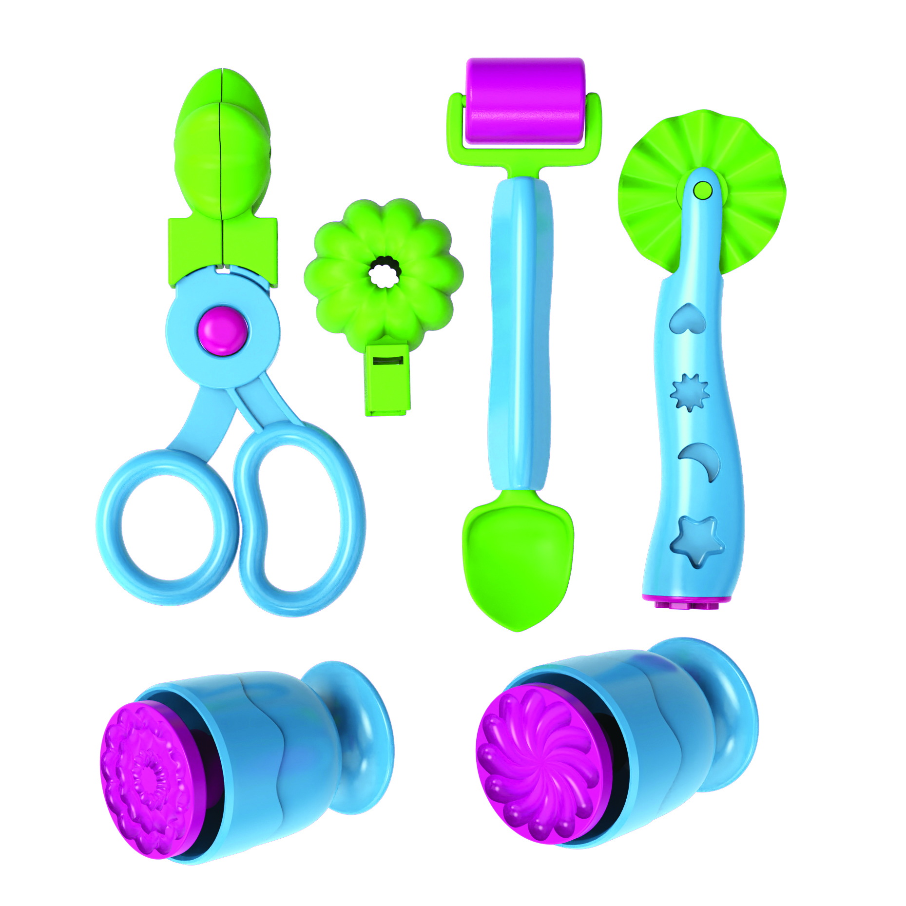 Inhalt: 3 x 6 oz (ca. 170 g) Playfoam Sand, 1 Scheren-Formwerkzeug, 2 Stempel, 1 doppelseitiger Roller / Scooper, 1 Schneidewerkzeug