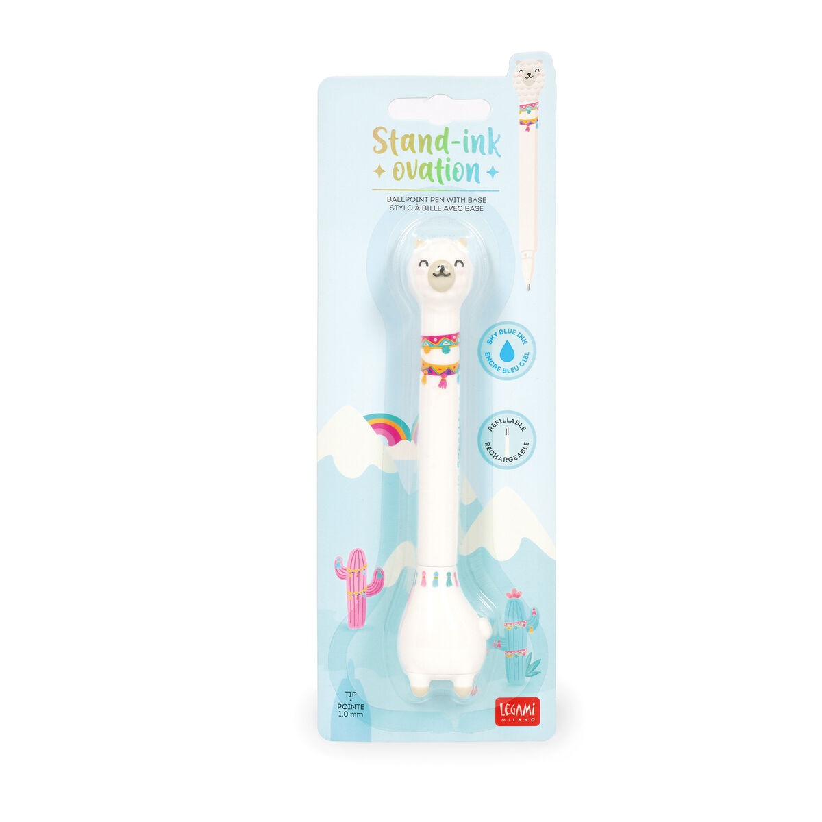 Ein echter Hingucker auf jedem Schreibtisch: Der Kugelschreiber mit Standfuß „Stand-Ink Ovation – Lama“ von Legami verbindet Funktionalität mit originellem Design. Das Besondere: Wenn du ihn gerade nicht benutzt, steht der Stift ganz von allein – bereit für seinen nächsten Einsatz.