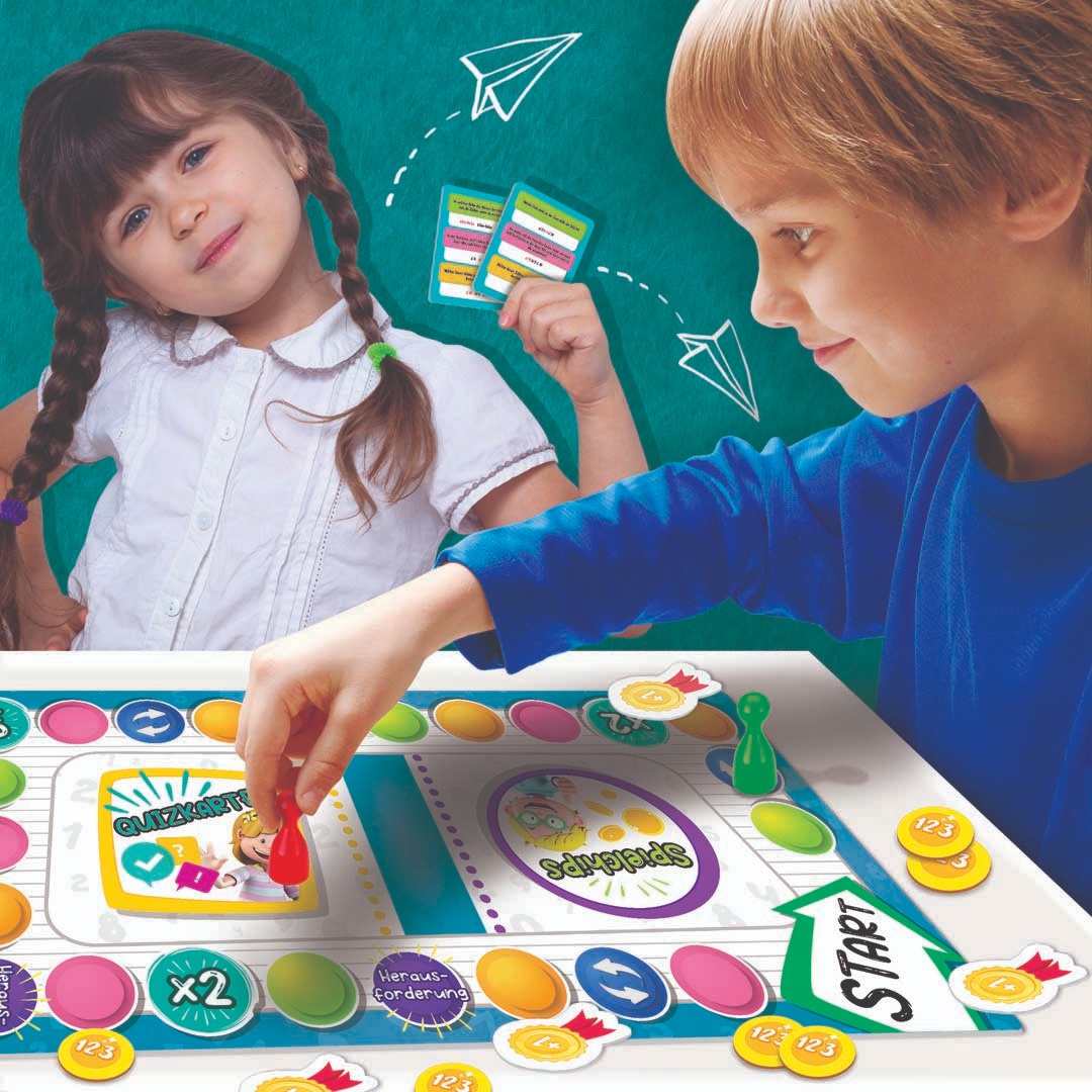 Inhalt: 1 Spielplan, 4 Spielfiguren, 1 Drehpfeil, 48 Quizkarten, Spielchips und Medaillen, Sonderkärtchen für die Minispiele.