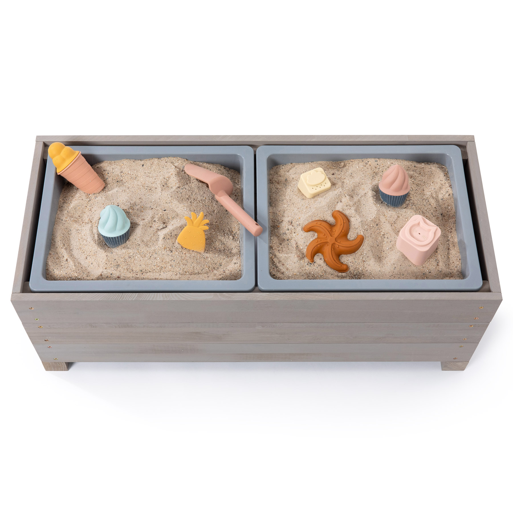 Diese hochwertige Kindersitzbank aus nachhaltigem Holz bringt großen Outdoor-Spielspaß auf kleinem Raum. Mit ihren zwei herausnehmbaren Matschwannen und abnehmbaren Deckeln vereint sie gleich zwei Funktionen in einem Produkt: Als hübsche Sitzbank lädt sie zum Ausruhen ein, als Matschtisch oder Sandkiste sorgt sie für kreatives Spielen im Freien.