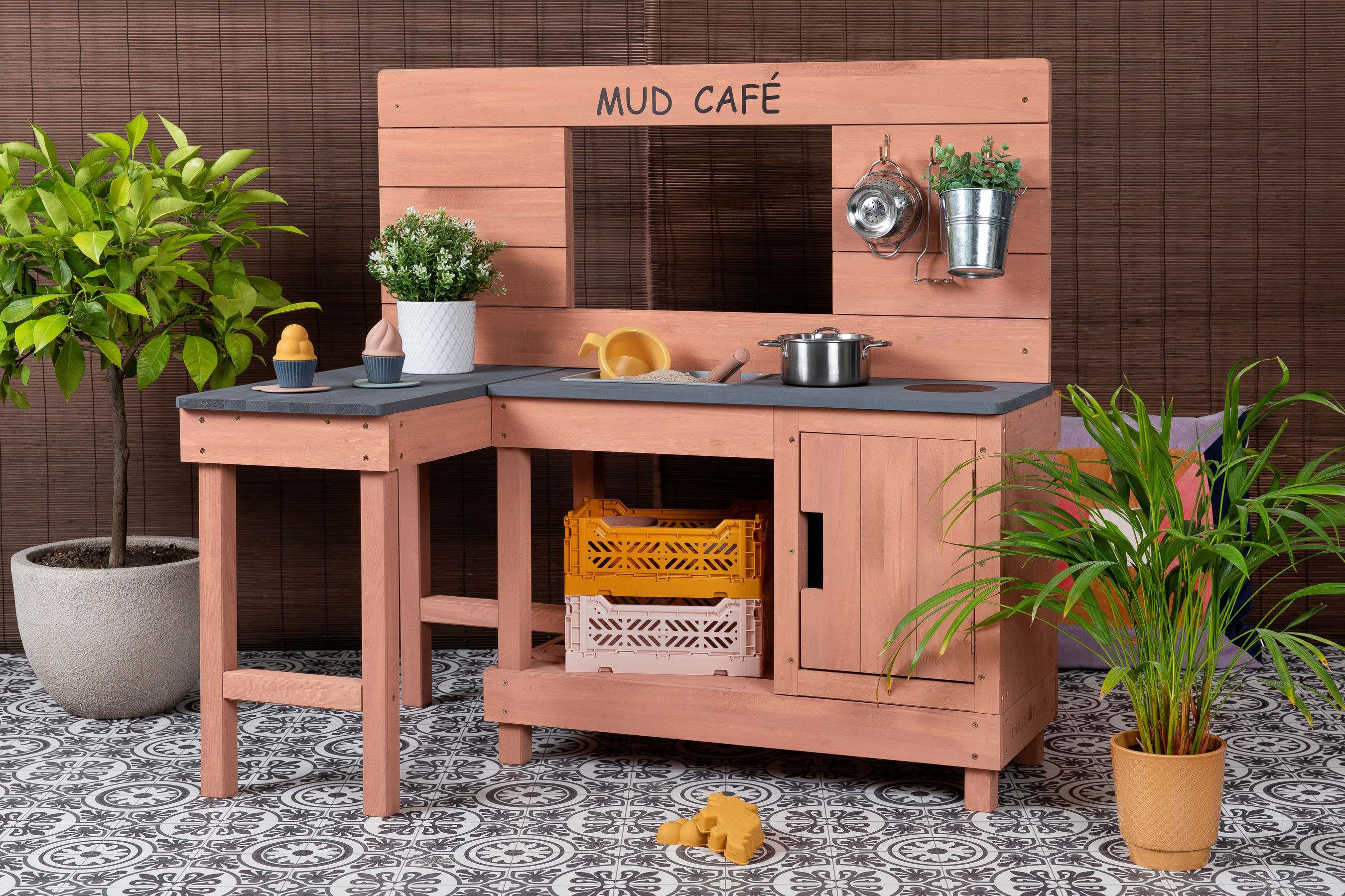 In der Outdoor Eck-Spielküche im Farbton Puderrosa wird aus Matschen ein echtes Café-Erlebnis! Dank des extra großen Tresens vereint diese liebevoll gestaltete Spielküche Matschküche und Café in einem Produkt. Hier servieren kleine Gastgeber*innen fantasievolle Leckereien wie Matsch-Muffins oder einen frisch gebrühten Latte Matschino.