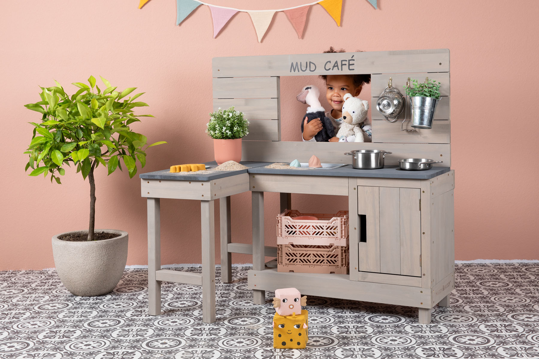 In der Outdoor Eck-Spielküche im Farbton Warmgrau wird aus Matschen ein echtes Café-Erlebnis! Dank des extra großen Tresens vereint diese liebevoll gestaltete Spielküche Matschküche und Café in einem Produkt. Hier servieren kleine Gastgeber*innen fantasievolle Leckereien wie Matsch-Muffins oder einen frisch gebrühten Latte Matschino.