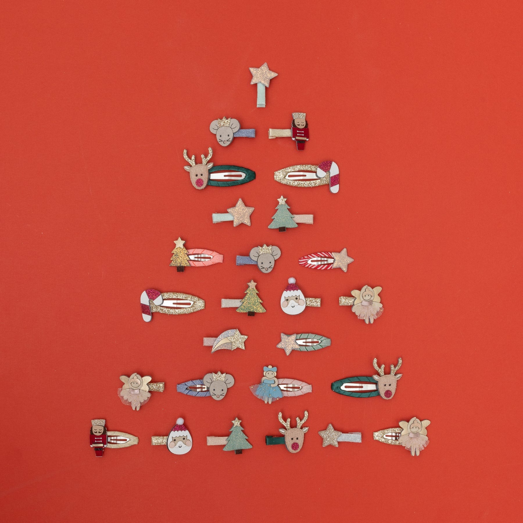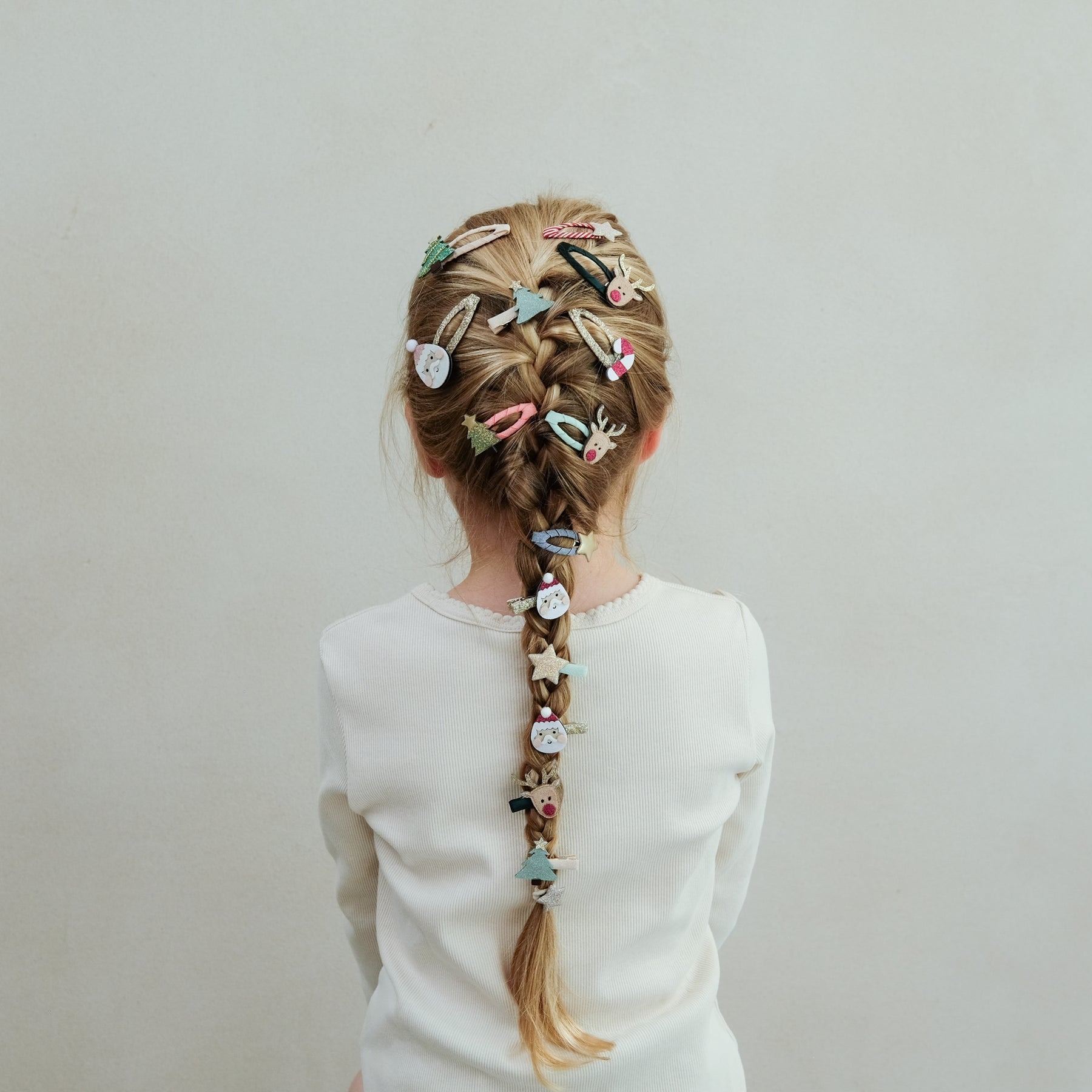 Feiere Weihnachten mit Santa & Rudolf! Das Set enthält acht winzige Mini-Haarspangen in Rot, Grün und Gold, ideal, um festliche Frisuren zu verschönern. Die Clips sind leicht anzubringen, sicher für Kinderhaar und bringen weihnachtliche Freude in jeden Look – perfekt für kleine Styling-Fans.