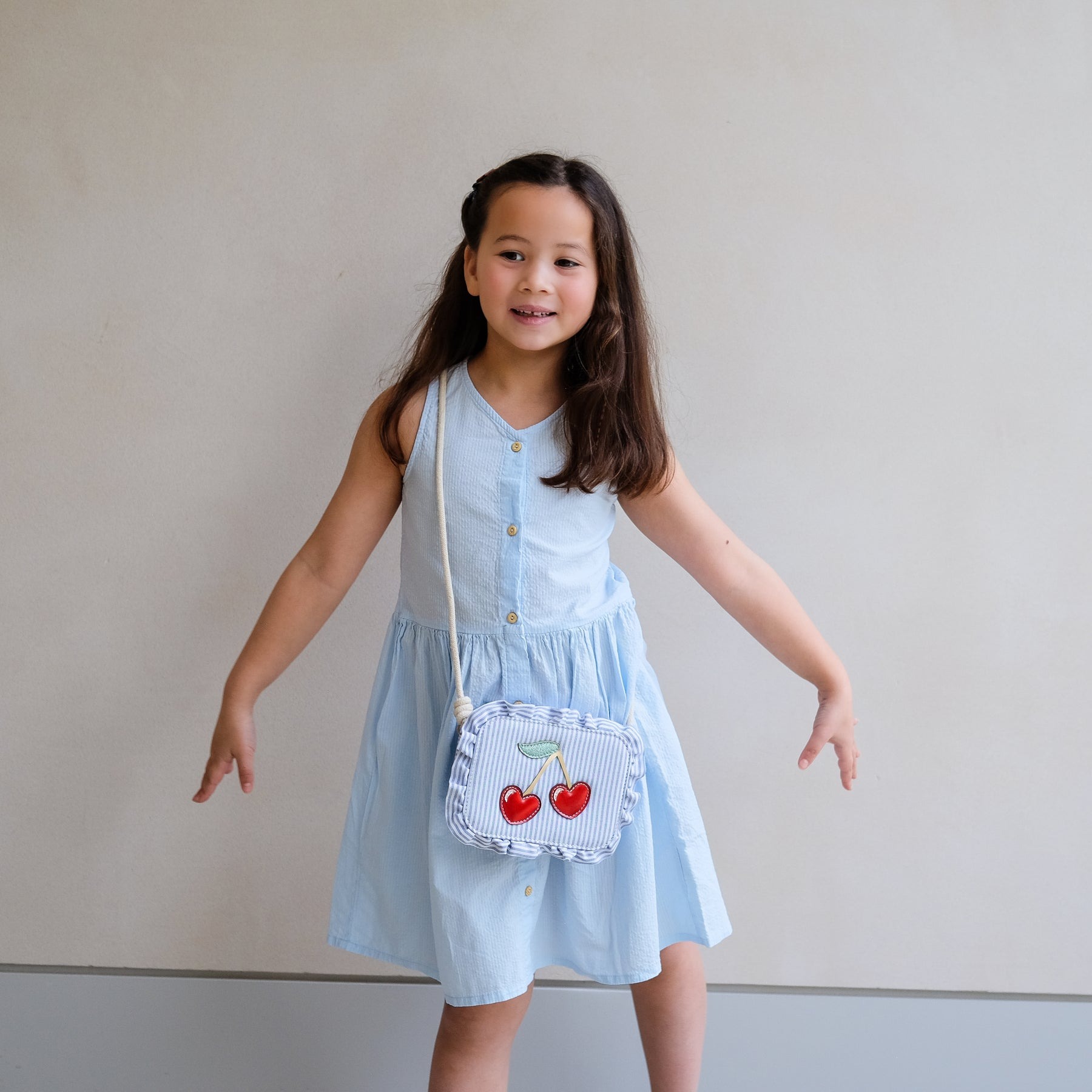 Unsere gestreifte Kirschtasche ist ebenso entzückend wie praktisch – ein echtes Statement-Accessoire für kleine Fashionistas! Das Design kombiniert hellblau-weiße Streifen, verspielte Rüschenkanten und zwei auffällige metallisch rote Kirschen mit grünem Glitzerblatt und goldenen Stielen.