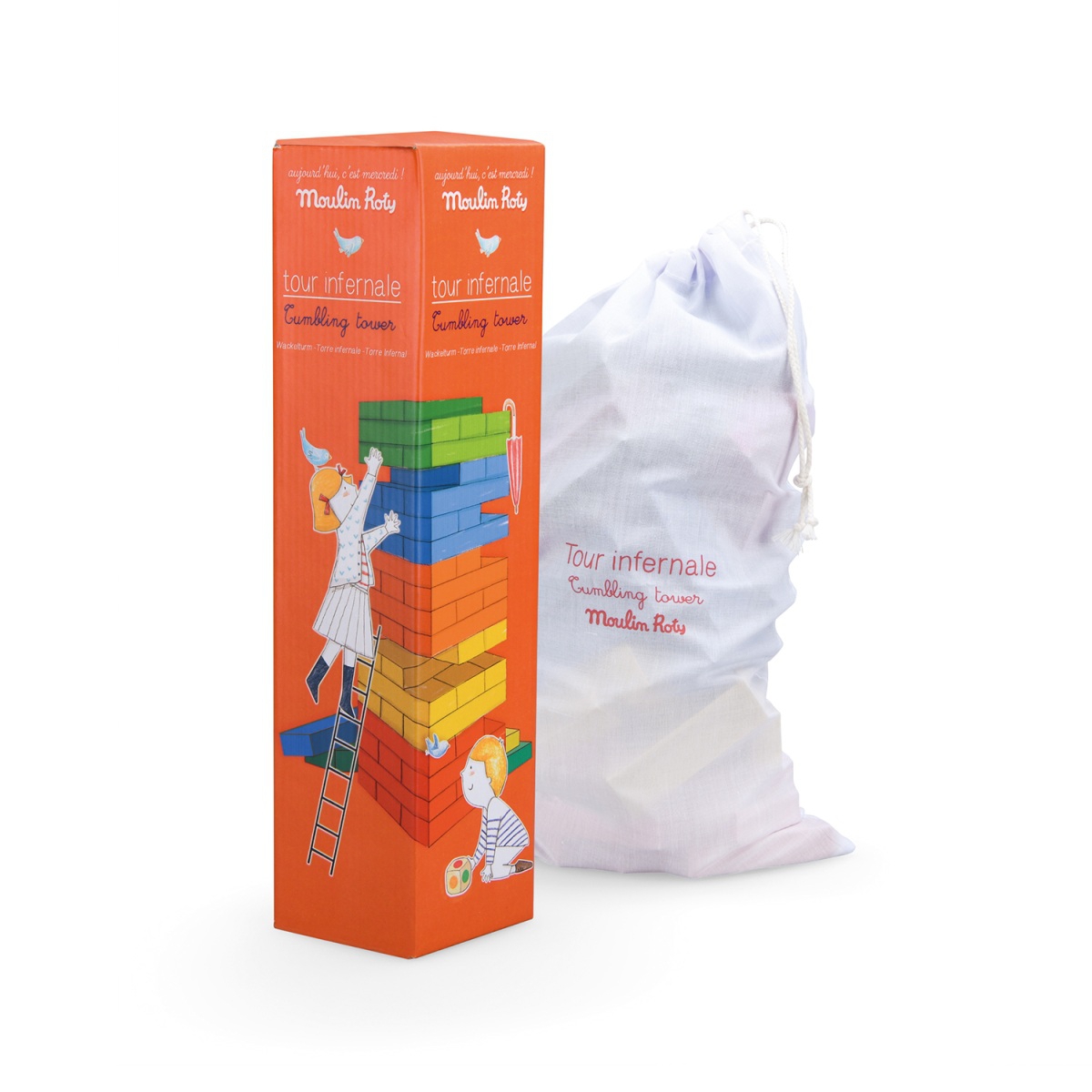 Jenga Spiel mit bunten Holzklötzen. Der mit gelieferte Würfel bestimmt, welche Farbe entfernt werden muss.
