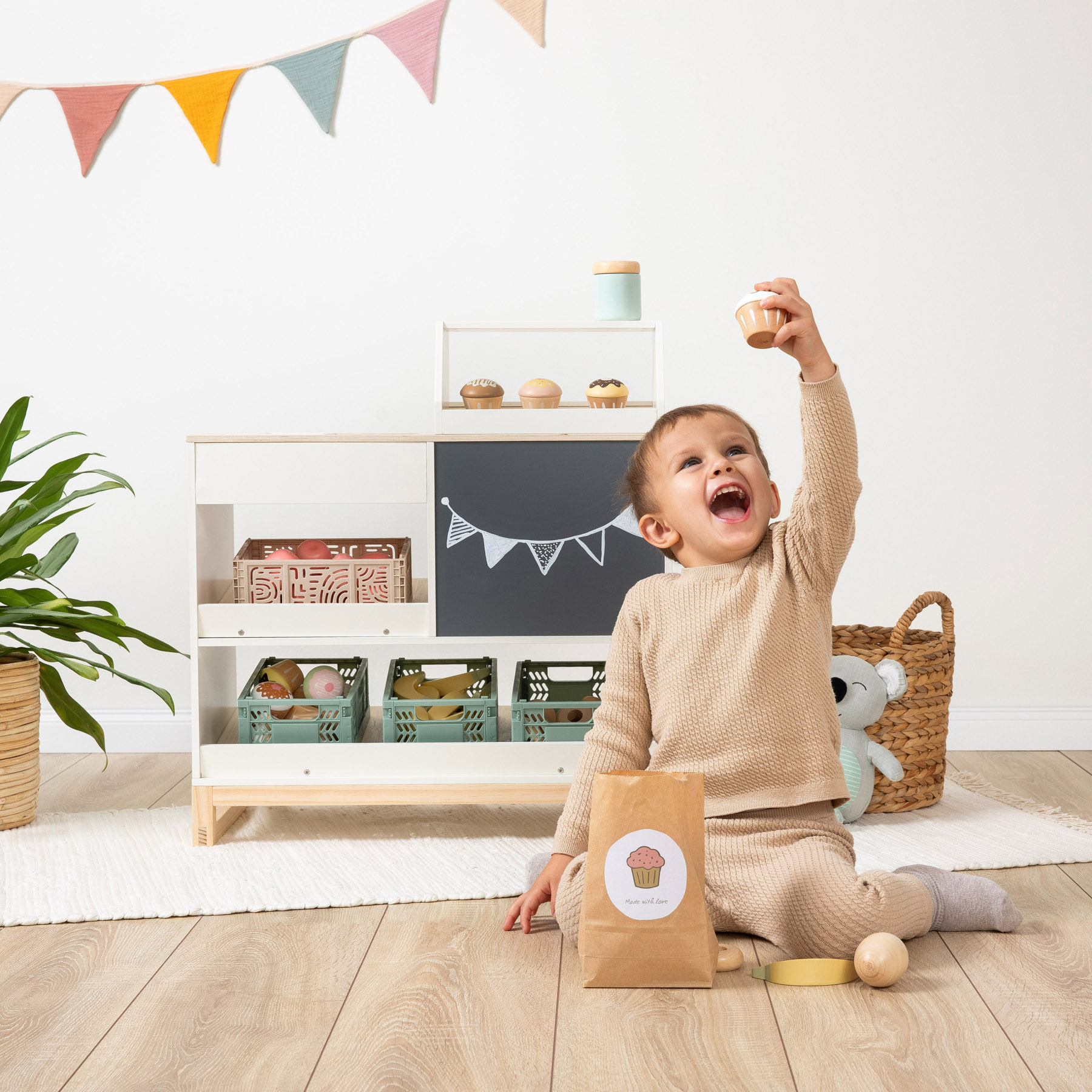 Hey, kleiner Händler! Der kompakte Kaufladen von Musterkind aus nachhaltigem Holz bringt echtes Markt-Feeling direkt ins Kinderzimmer. Trotz seiner handlichen Größe bietet er zahlreiche Auslagen, die reichlich Platz für Obst, Gemüse, Backwaren oder andere Lieblingsprodukte schaffen.