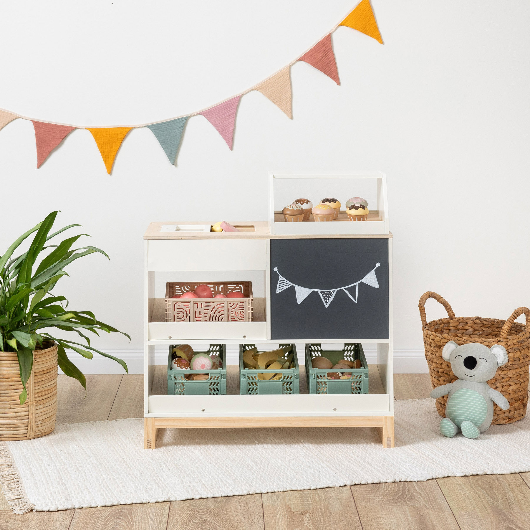 Besondere Highlights sind die authentische Kuchenauslage mit Acrylglasfront, ein Eisfach mit Schiebetür sowie eine graue Kreidetafel für individuelle Gestaltungsideen. So entstehen realistische Rollenspielmomente, die Fantasie und Kreativität fördern.