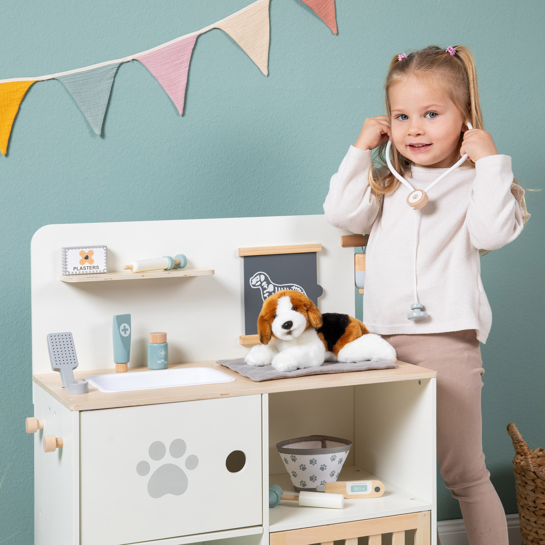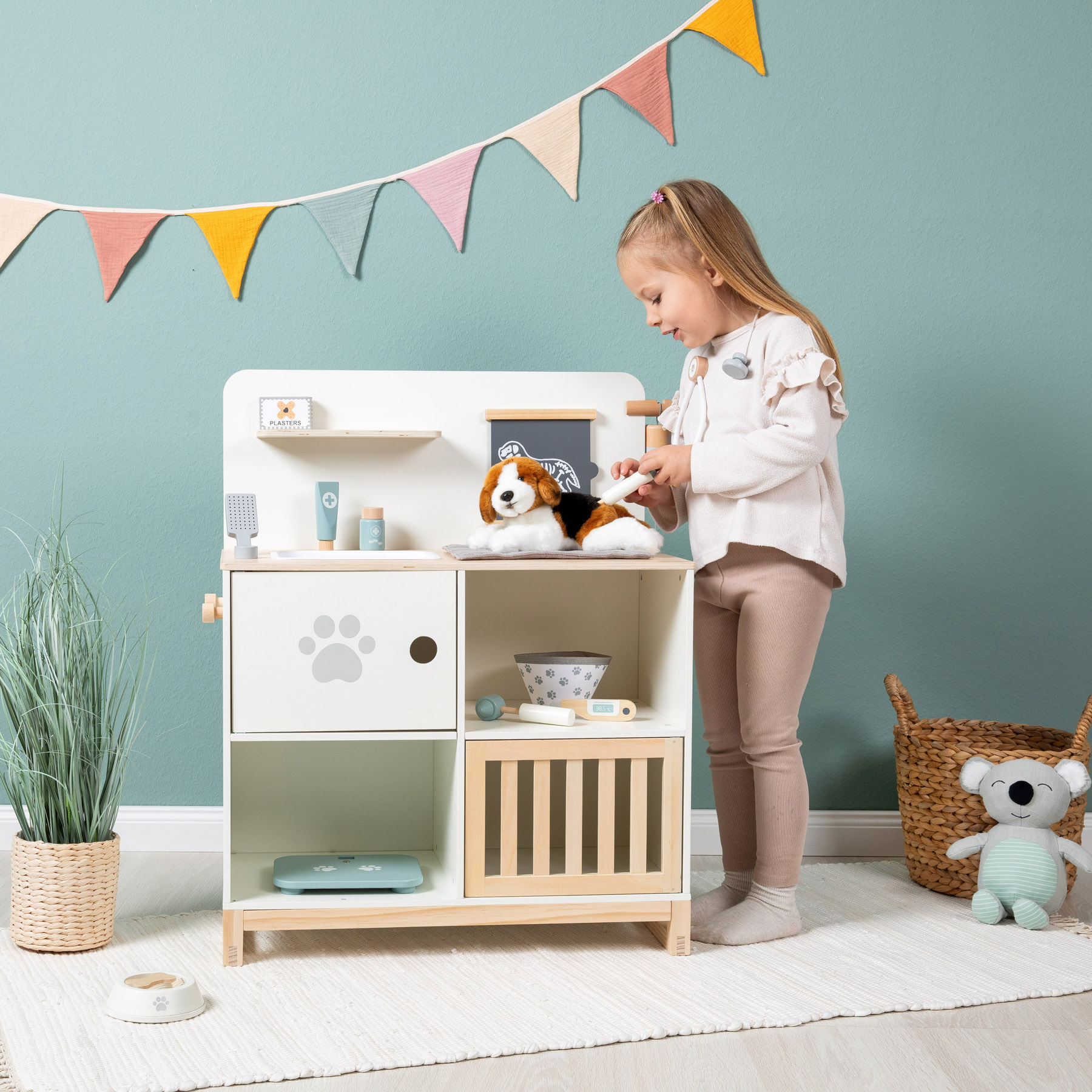 Ob Fieber messen, Wunden versorgen oder Leckerli verteilen – hier ist alles griffbereit für kreative Rollenspiele und liebevolle Behandlungen kleiner Plüschtierpatienten. Ein besonderes Highlight: Neben typischen Instrumenten wie Stethoskop, Spritze und Thermometer enthält das Set auch süße Fisch- und Knochen-Leckerli. So wird der Tierarztbesuch zum spielerischen Erlebnis.