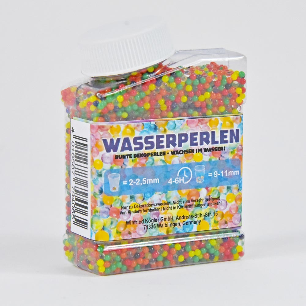 Die bunten Wasserperlen sind vielseitig einsetzbar und faszinieren durch ihre Verwandlung: In trockenem Zustand haben sie eine Größe von ca. 2–2,5 mm und sind hart. Legt man sie für 4–6 Stunden ins Wasser, wachsen sie auf beeindruckende 9–11 mm heran und werden elastisch. Perfekt geeignet als kreative Dekoration für Partys, Hochzeiten oder Blumenvasen. Außerdem lassen sich mit ihnen tolle DIY-Ideen umsetzen, wie z. B. ein selbstgemachter Antistressball, wenn die Perlen in einen Luftballon gefüllt werden.