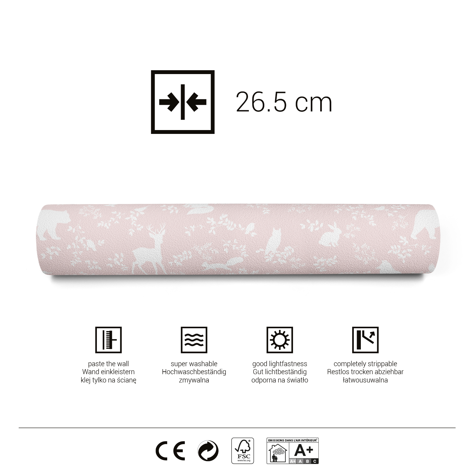 Rolle Tapeten für Kinder (0,53x10 m) Pastelowe Love® Forest Animals pink. Perfekt für jedes Kinderzimmer.