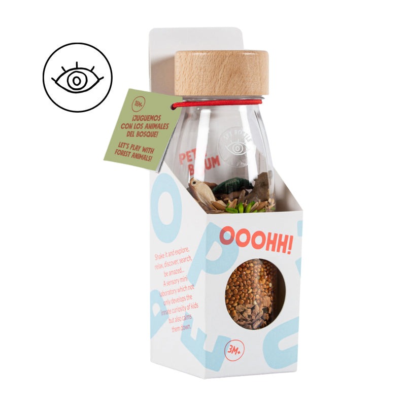 EIN MIKROKOSMOS IN JEDER FLASCHE In jeder der Spy Bottles wird eine natürliche Umgebung mit Tieren nachgestellt, die zu den Hauptfiguren in der Fantasie der Kinder werden. Die Kinder werden Spaß daran haben die Tiere zu identifizieren, sie zu imitieren, sie aufzulisten und Geschichten zu erfinden oder einfach etwas über die verschiedenen Ökosysteme. Ein echter Magnet für die Neugierde der Kinder.
