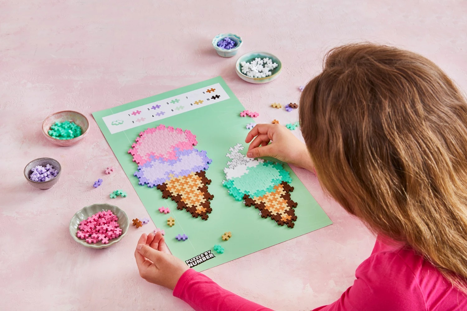 Dieses Puzzle by Number Set von PLUS PLUS sorgt für kreativen Bauspaß mit süßem Eis-Design! Mit 250 bunten Bausteinen entstehen im Handumdrehen niedliche 2D-Eiswaffeln – perfekt zum Dekorieren oder Verschenken.