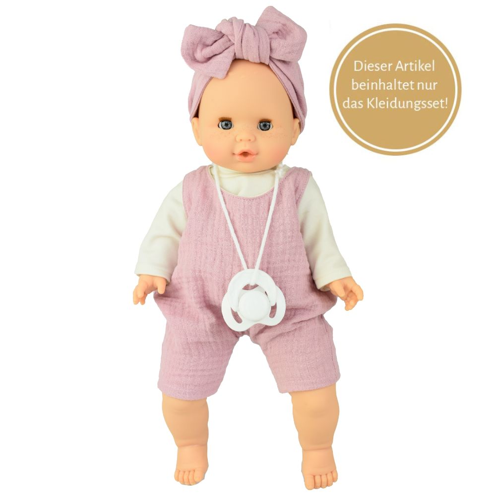 Das liebevoll gestaltete Outfit besteht aus einer weichen Musselin-Latzhose in zartem Rosé und einem passenden Haarband. Die hochwertigen Stoffe sorgen für einen angenehmen Griff und verleihen der Puppenkleidung einen natürlichen, zeitlosen Look. Perfekt zum An- und Ausziehen – ideal, um das Lieblingspüppchen immer wieder neu einzukleiden und fantasievolle Rollenspiele zu gestalten.