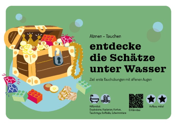 Mit diesem liebevoll gestalteten Kartenset mit 15 Schwimmkarten wird das Schwimmenlernen für Kinder spielerisch und stressfrei – ganz ohne strengen Kurs, aber mit viel Freude und Erfolgserlebnissen. Die 15 robusten, wasserfesten DIN-A5-Karten enthalten über 50 praxiserprobte Übungen zur Wassergewöhnung und zu den Grundtechniken des Schwimmens: vom Gleiten über Schweben bis hin zu Antreiben und Springen.