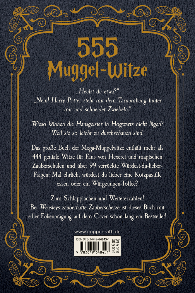 Das große Buch der Mega-Muggelwitze bietet über 444 witzige Muggel-Scherze und knifflige Scherzfragen sowie mehr als 99 lustige "Würdest du lieber"-Fragen. Ein Muss für alle Fans von Magie und Zauberschulen – zum Lachen und Teilen! Mit hochwertiger Folienprägung auf dem Cover.