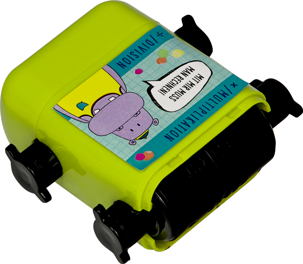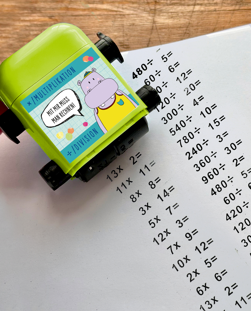 Der Spiegelburg Rechen-Roll-Stempel macht Mathelernen spielerisch und interaktiv. Mit diesem doppelseitigen Roll-Stempel können Kinder Aufgaben zu Division und Multiplikation üben. Über die Rädchen lassen sich die Zahlenfolgen individuell einstellen – einfach abrollen und losrechnen!