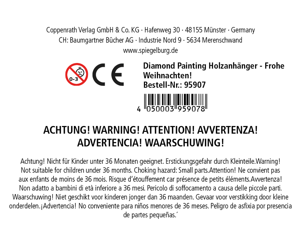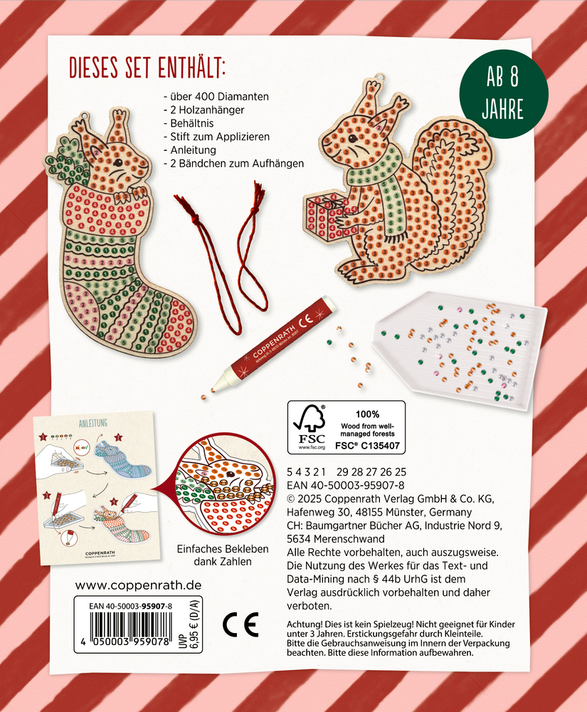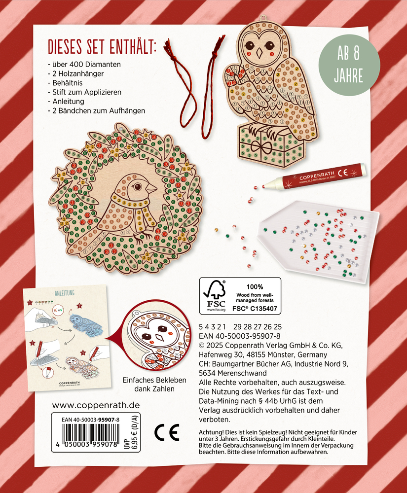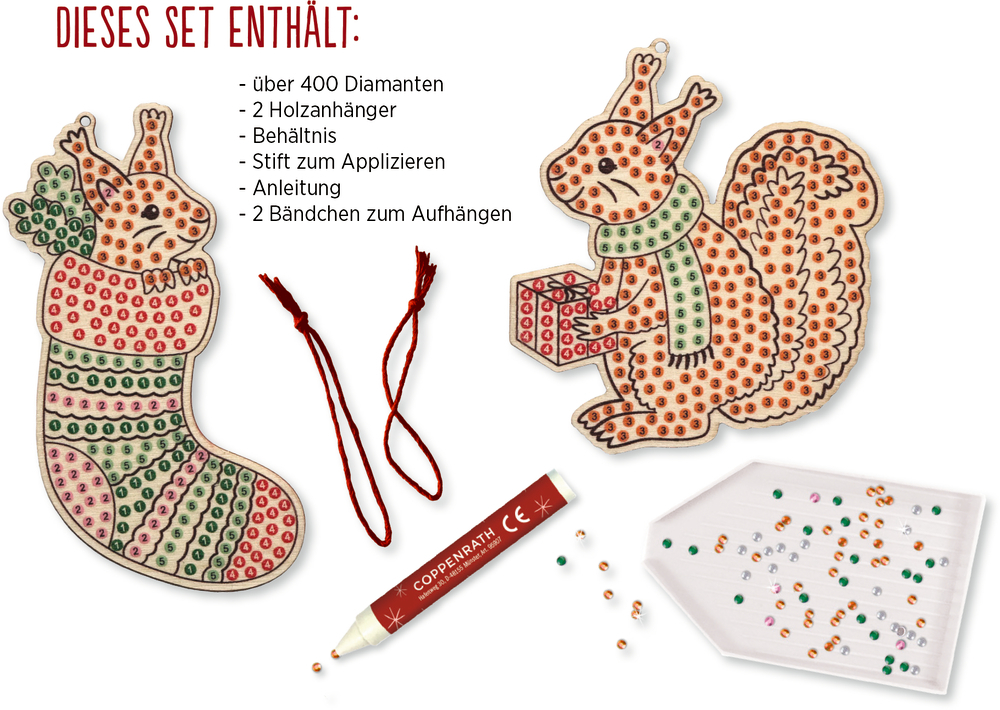 Ausstattung: in bedruckter Kartonverpackung (13 x 16 x 1,5 cm) mit 2 Holzanhängern, Diamonds, Stift zum Applizieren, Behältnis und Anleitung