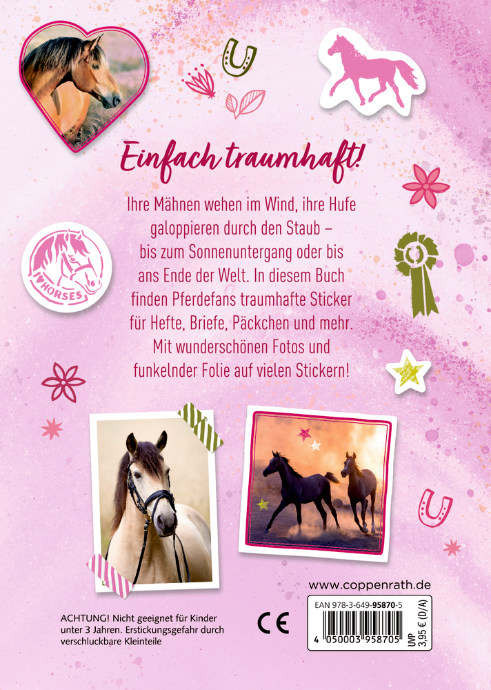 Funkelnde Sticker – Pferdefreunde Glitzernde Pferdeträume zum Sammeln, Verschenken und Dekorieren! Diese funkelnden Sticker lassen die Herzen aller Pferdefans höherschlagen. Mit wunderschönen Motiven, tollen Fotos und schimmernder Folienveredelung sind sie perfekt, um Hefte, Briefe, Päckchen und vieles mehr zu verschönern. Ein tolles Highlight für alle, die Pferde lieben!