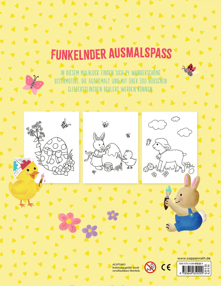 Funkelnder Mal- und Stickerspaß zu Ostern! Der liebevoll gestaltete Malblock mit Glitzersteinchen „Frohe Ostern“ begeistert Kinder ab 5 Jahren mit 24 fröhlichen Oster-Motiven rund um Häschen, Küken und Co.