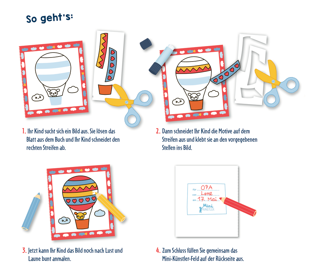 Die beiliegende Kinderschere aus Kunststoff schneidet nur Papier – keine Haare, Haut oder Textilien – und sorgt so für unbesorgtes Spielen. Die klar konturierten, fröhlichen Motive auf perforierten Seiten lassen sich leicht herauslösen, bemalen, bekleben oder aufhängen.