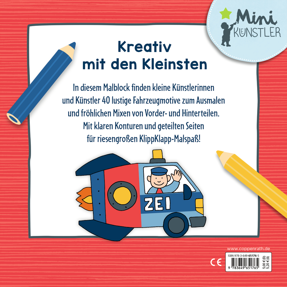 Ausmalen, umklappen, neu erfinden! In diesem kreativen Malblock warten 20 lustige Fahrzeuge darauf, farbenfroh gestaltet zu werden. Das Besondere: Die Seiten sind geteilt – so können kleine Künstlerinnen und Künstler Vorder- und Hinterteile beliebig kombinieren und dadurch bis zu 400 witzige Fahrzeugkombinationen erschaffen.