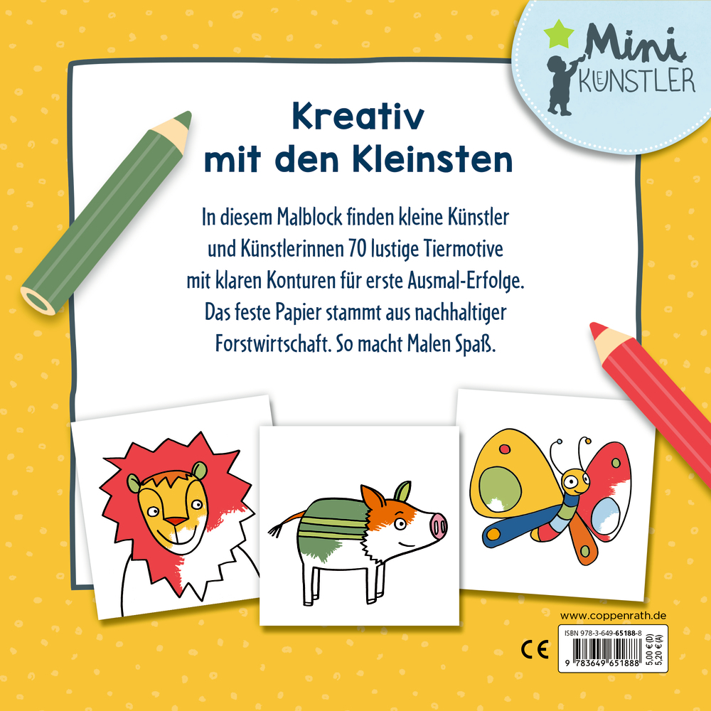 Auf 140 Seiten im handlichen Format von 19 x 19 cm können Kinder ab 24 Monaten süße Tiermotive ausmalen. Die Broschur ist robust genug für kleine Hände und macht das Buch ideal für zu Hause oder unterwegs.