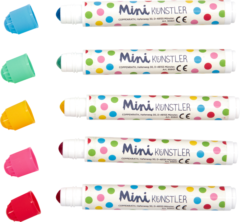 Meine superdicken Stempel-Stifte (Mini-Künstler) bieten kreativen Punktespaß für kleine Künstlerinnen und Künstler ab 3 Jahren. Das Set enthält 5 farbenfrohe Dotmarker in Gelb, Rosa, Rot, Grün und Blau sowie 3 kindgerechte Malvorlagen zum sofortigen Loslegen. Mit den extra dicken Stempelstiften lassen sich spielend leicht lustige Punkte und bunte Muster gestalten – ganz ohne Schmiererei oder Kleckern. Die Farben sind abwaschbar und somit bestens für kleine Kinderhände geeignet.