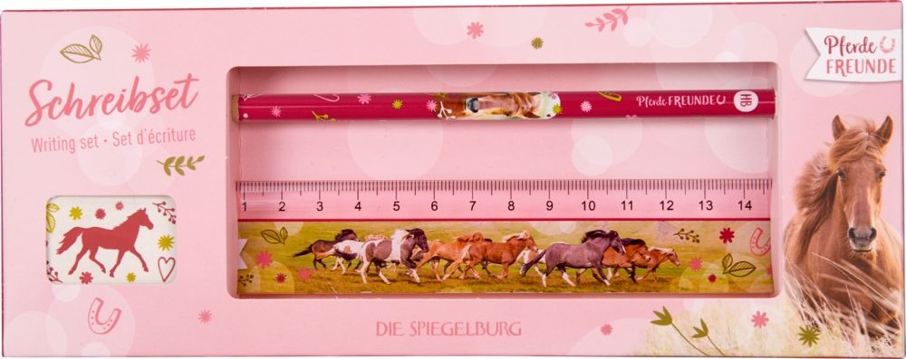 Zauberhaftes Schreibset für kleine und große Pferdefreunde. Das Set besteht aus einem HB-Bleistift, einem Radiergummi und einem Lineal (15 cm).