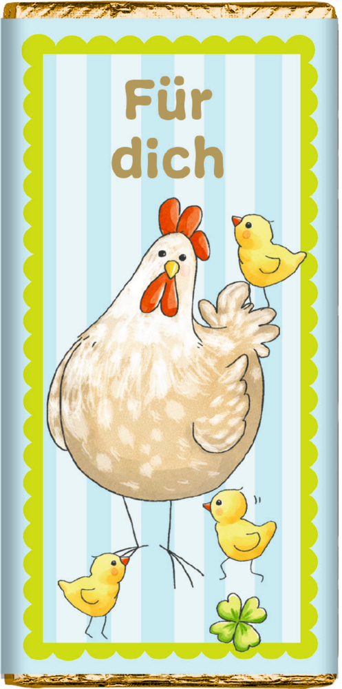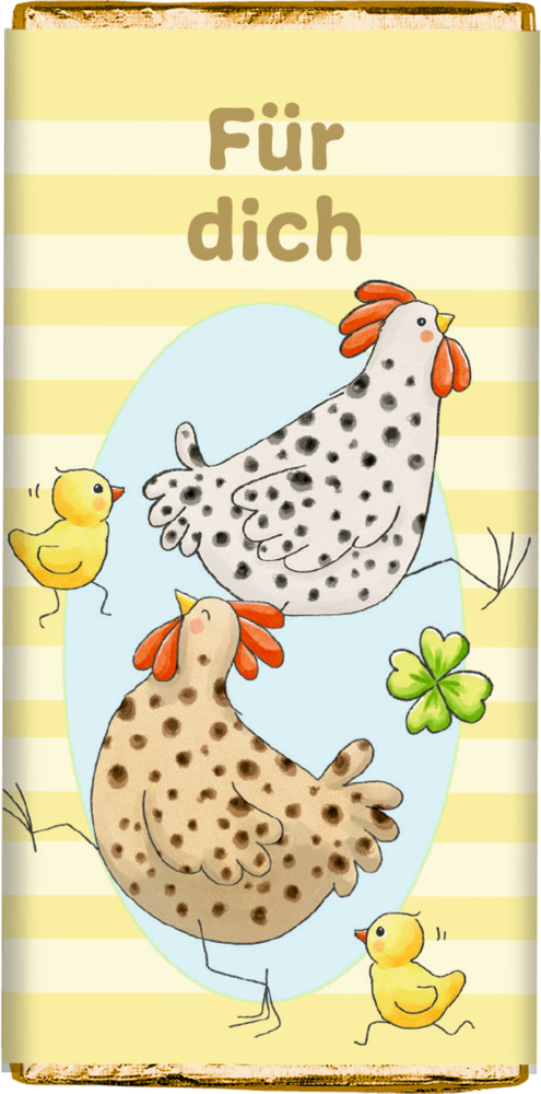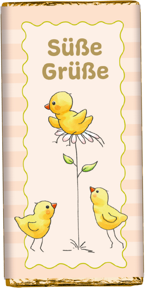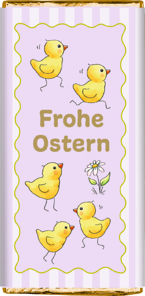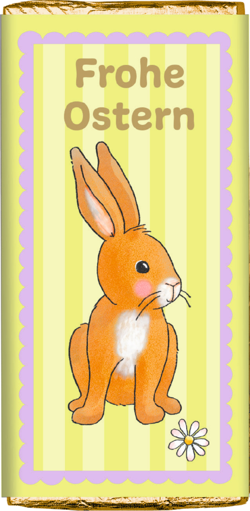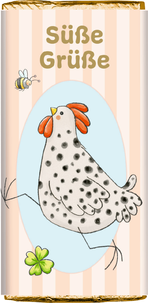 Vollmilchschokolade mit liebevollen Ostermotiven und verschiedenen Botschaften, verpackt in glänzender Goldfolie. Ein charmantes Geschenk für die Osterzeit. Erhältlich in 6 verschiedenen Designs.