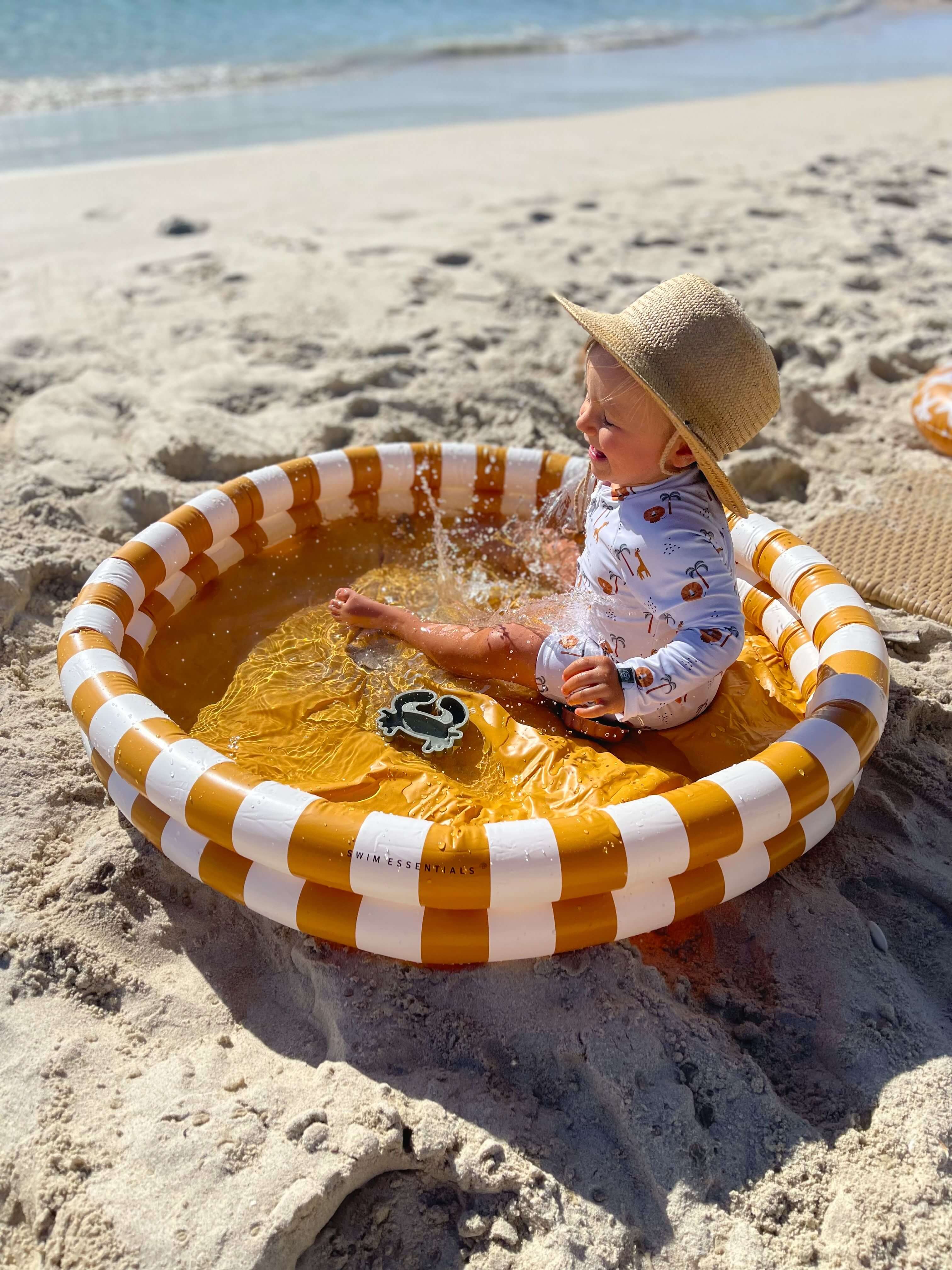 Der Baby-Pool (Ø 100 cm) von Swim Essentials mit dem zauberhaften Yellow Stripes-Muster ist ein echtes Sommer-Must-have. Einfach aufstellen, mit Wasser füllen und los geht der Planschspaß. Mit seinem coolen Design macht er deinen Garten noch schöner und sorgt für fröhliche Stunden im Wasser. Perfekt für warme Sommertage, also rein ins Vergnügen.