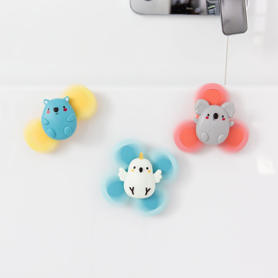 Dieses spaßige und interaktive Set eignet sich ideal als Geschenk zur Babyparty und fördert sensorisches Spiel, Feinmotorik und Ursache-Wirkung-Lernen. Jedes Set enthält drei Aussie Animal Spinner (Kakadu, Koala und Wombat)
