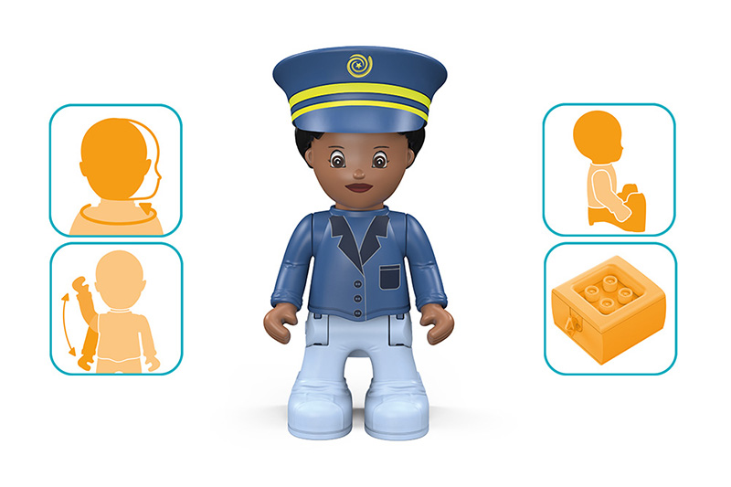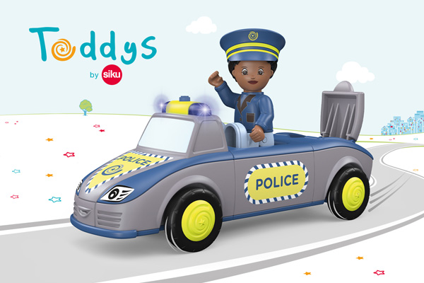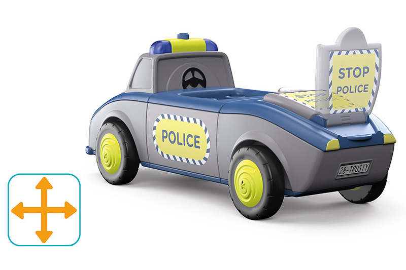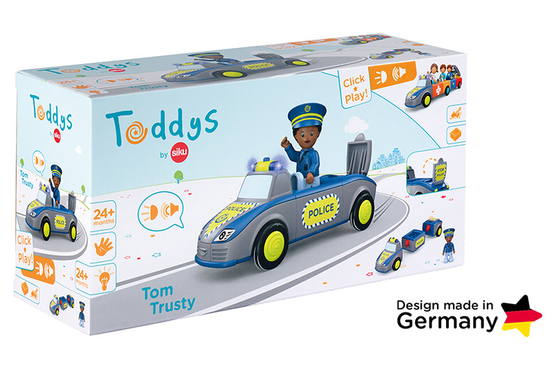 Die Spielfigur ist beweglich: Der Kopf lässt sich drehen, die Arme lassen sich heben und die Beine können angewinkelt werden. Das Fahrzeug lässt sich in drei Teile zerlegen und mit weiteren Toddys-Fahrzeugen kombinieren. Licht- und Soundeffekte zur Unterstützung der Fahrzeugcharakteristik. Tom Trusty ist kompatibel mit Bausteinen anderer Hersteller. Trusty hat eine Schild zum Hochklappen mit der Aufschrift "STOP POLICE"