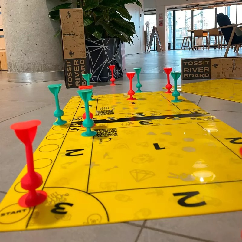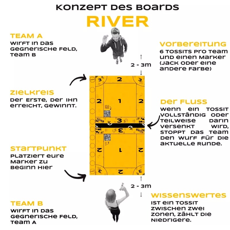Das Tossit Family Board ist durch eine „River-Zone“ in zwei Spielfelder getrennt. Punkte gibt es nur, wenn die Darts im gegnerischen Feld landen – landet ein Dart im River, muss der Spieler aufhören. Wer zuerst genau 21 Punkte erreicht, gewinnt!