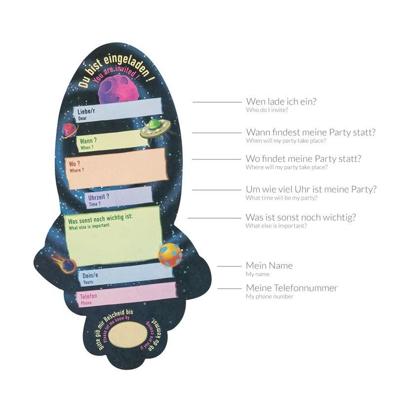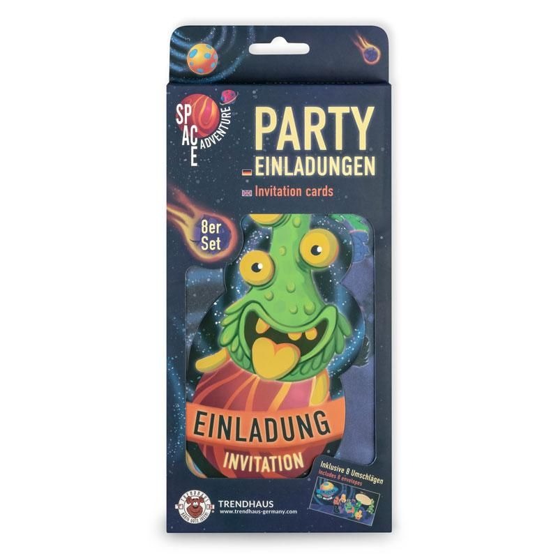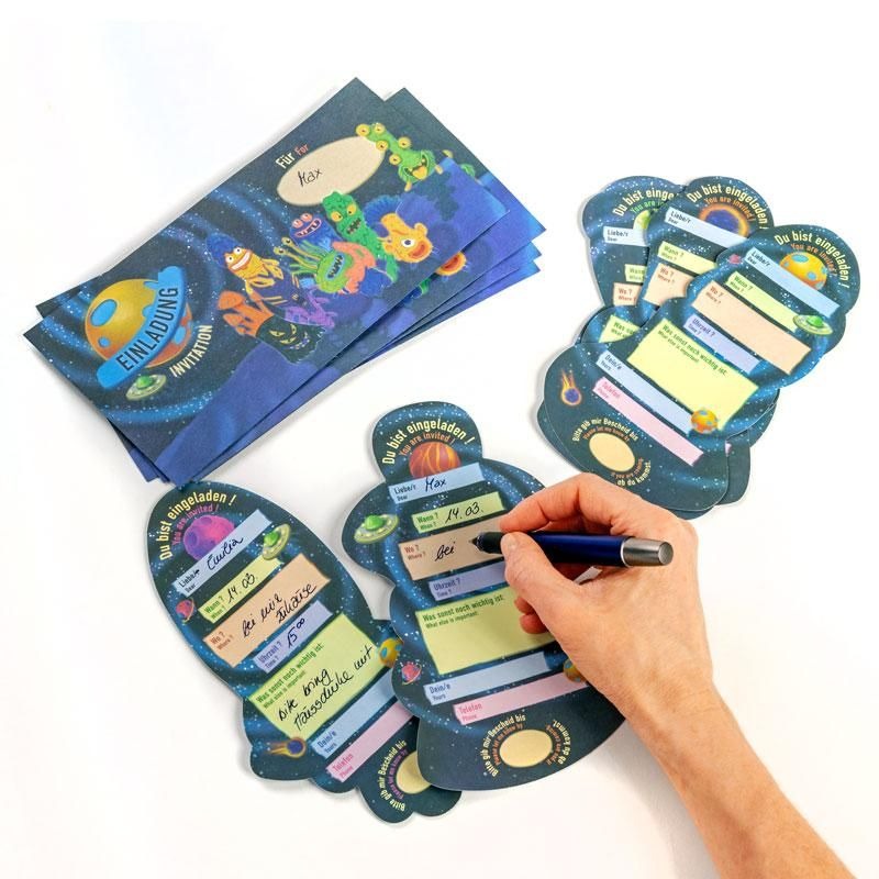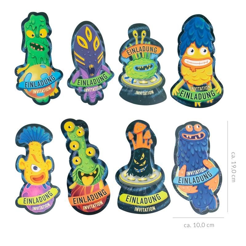 Galaktisch gut! Mit diesem besonderen Einladungskarten-Set wird die nächste Party zum Hit! Die 8 verschiedenen Monster-Motiv-Karten mit Soft-Touch-Veredelung sind zweisprachig (Deutsch und Englisch) im coolen Space-Design gestaltet und zum praktischen Ausfüllen konzipiert. Zusammen mit den dazu passenden Briefumschlägen, die personalisiert werden können, sind sie die perfekte Kombi, um auf einfache und schnelle Weise zu einer tollen Party einzuladen.