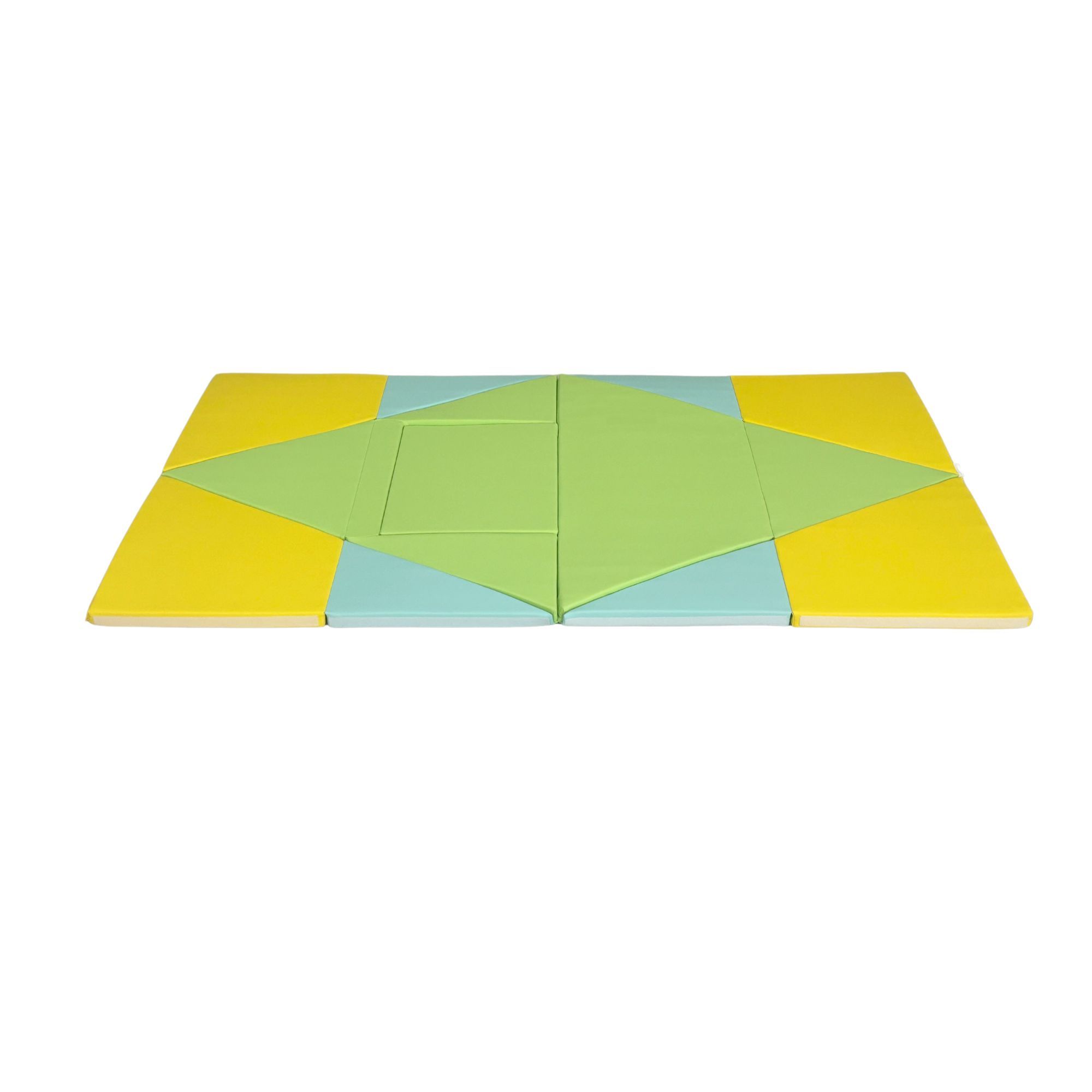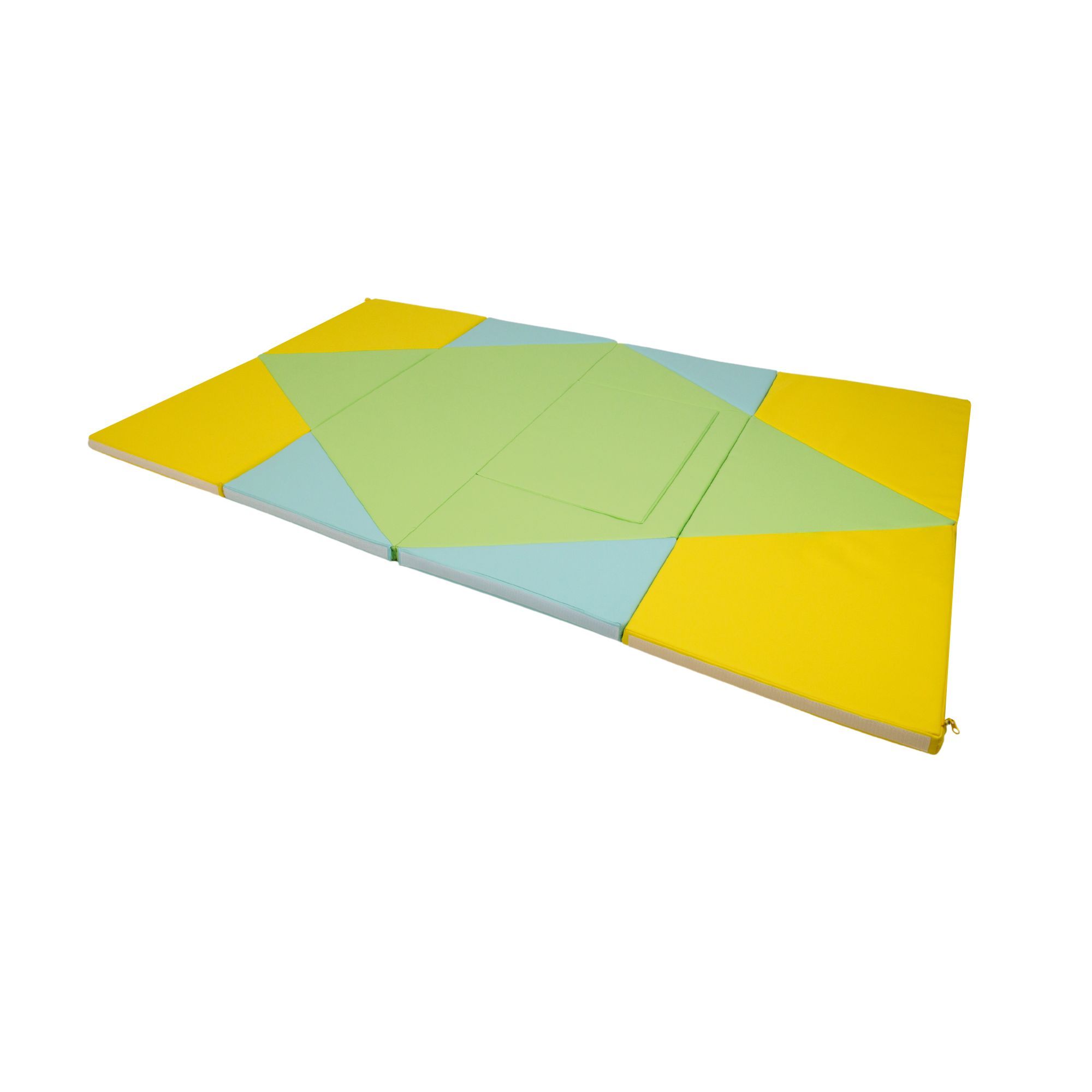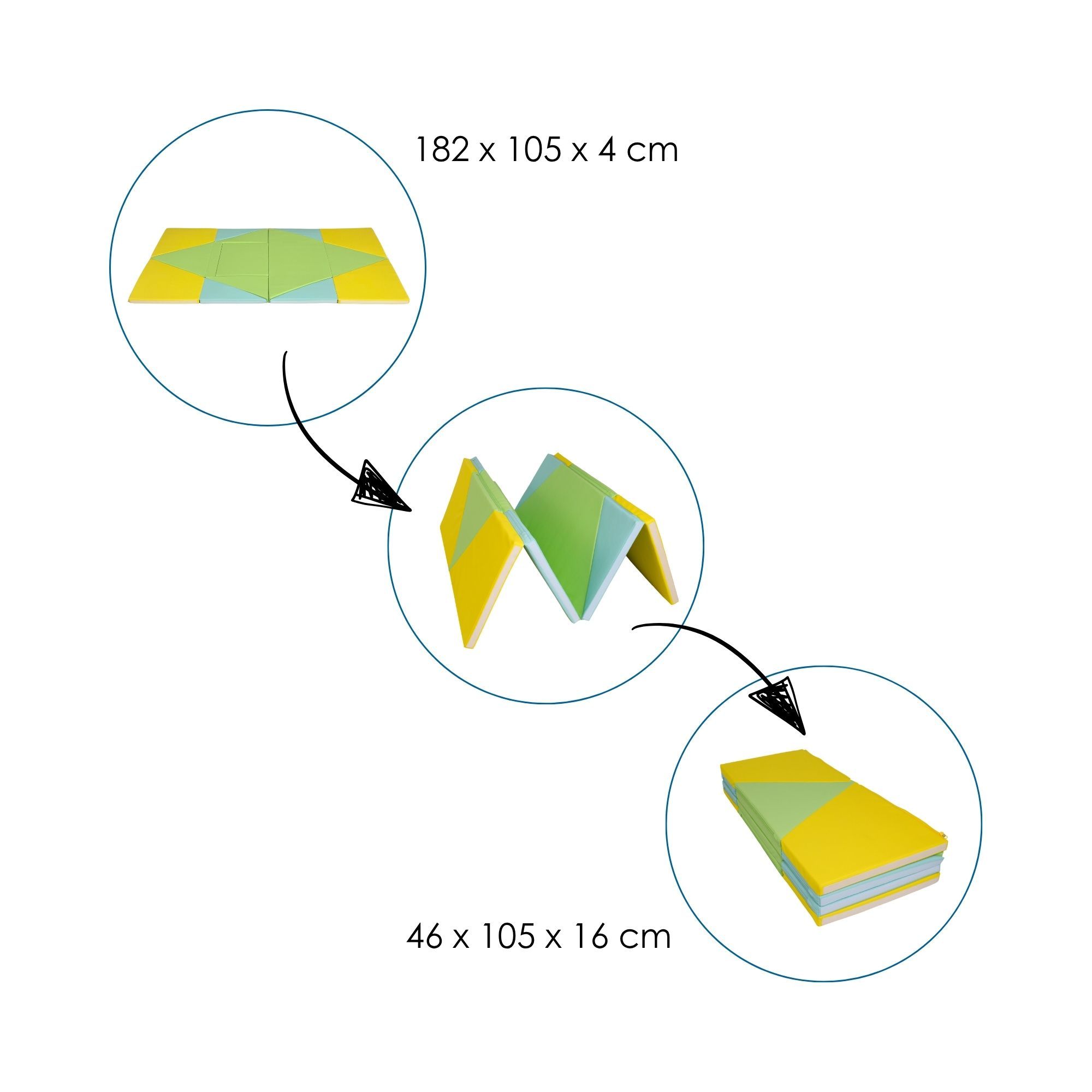 Praktisch: Mit wenigen Handgriffen lässt sich die Spielmatte von 182 x 105 cm auf ein kompaktes Maß von 46 x 105 x 16 cm zusammenfalten – perfekt für platzsparendes Verstauen oder Mitnehmen.