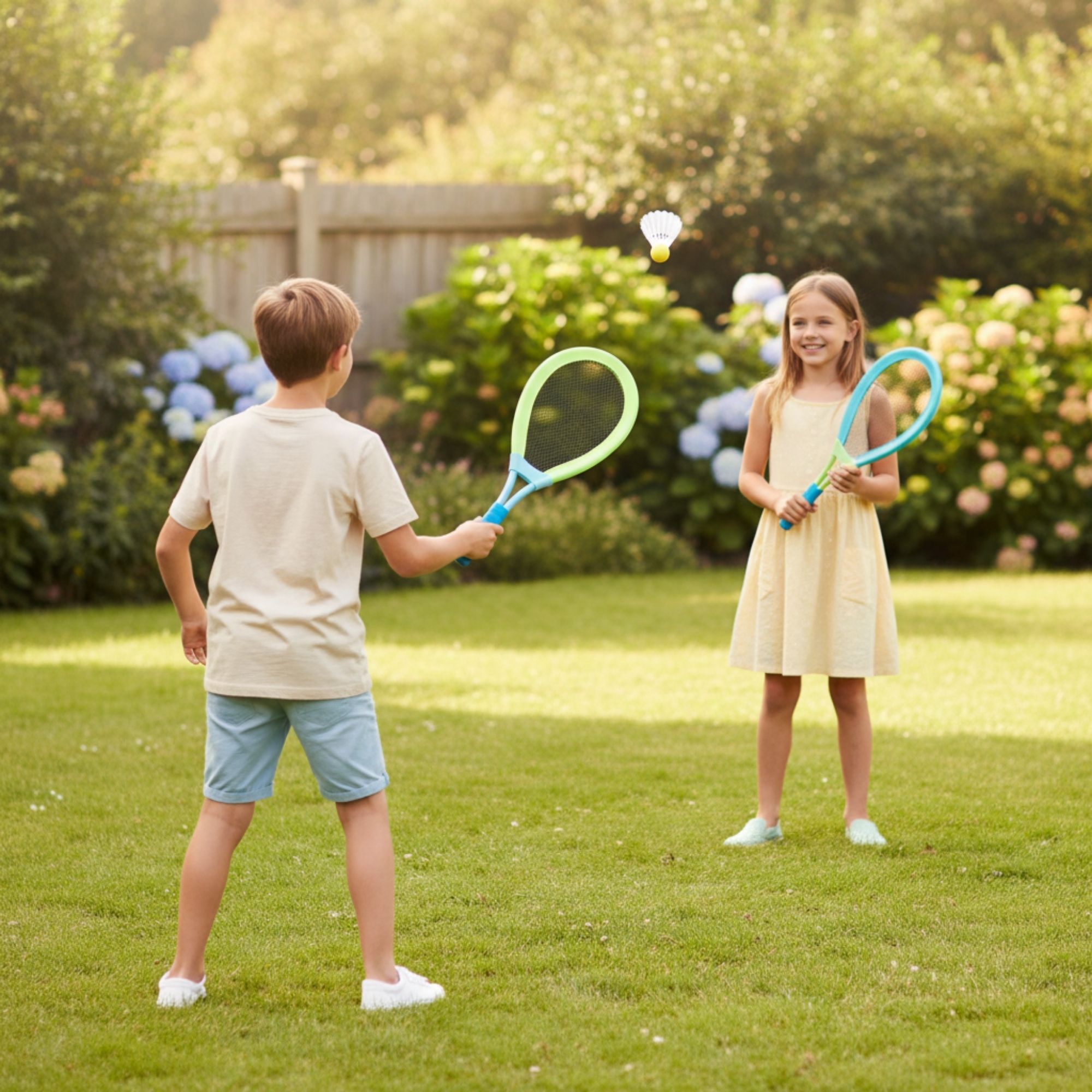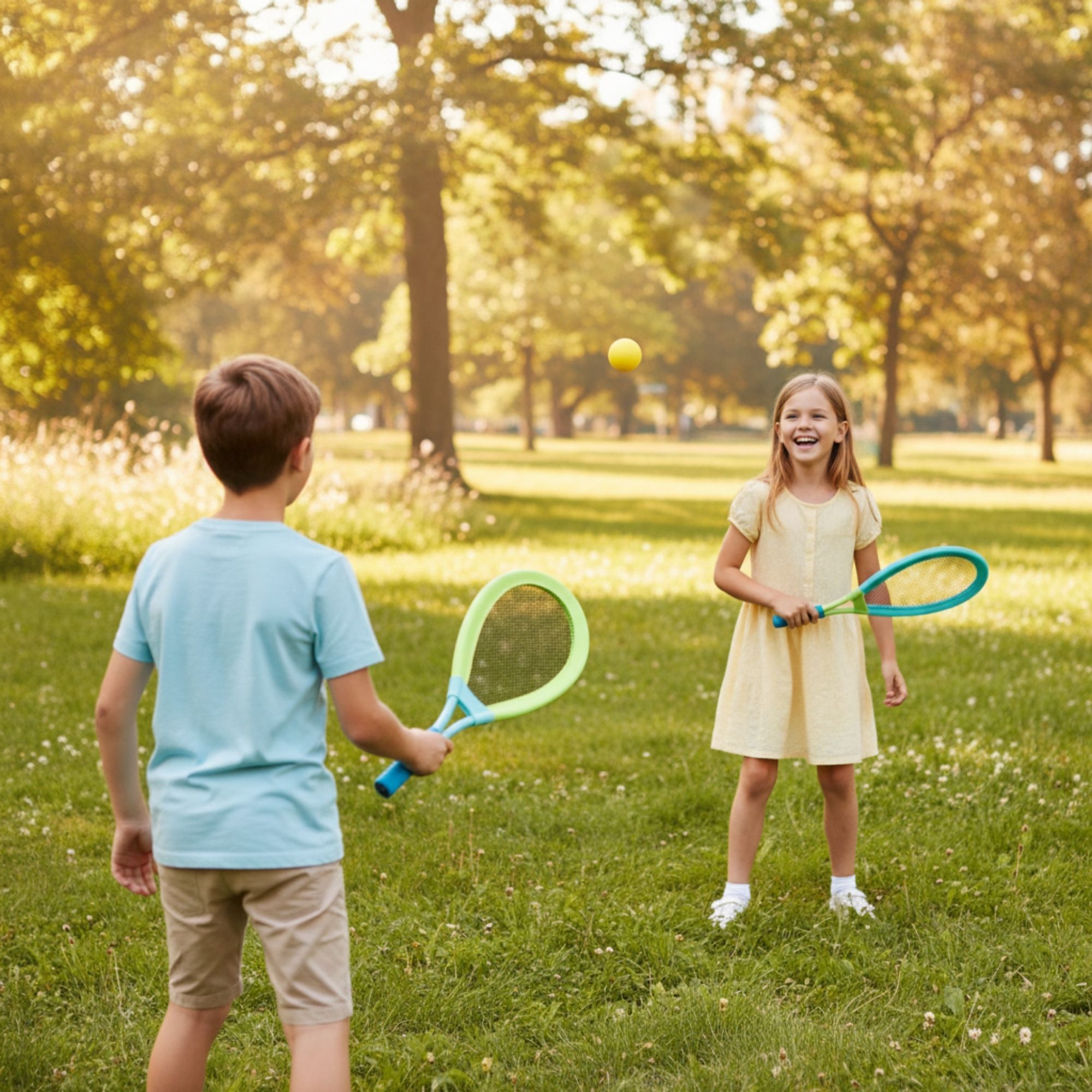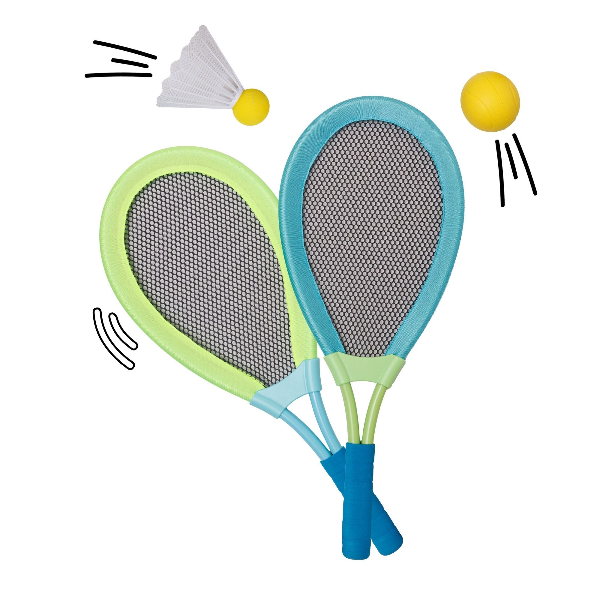 Die übergroßen Schläger (ca. 62 × 26 cm) erleichtern besonders Kindern und Einsteigern das Treffen des Balls. Dadurch entstehen schnell erste Erfolgserlebnisse und spannende Ballwechsel. Ob mit dem Federball für präzisere Schläge oder mit dem Softball für dynamischere Spielrunden – dieses Set sorgt für abwechslungsreiche Outdoor-Action.