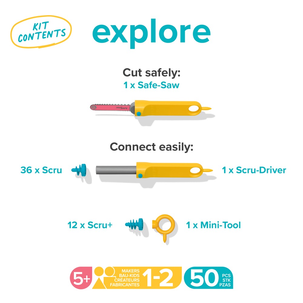 Mit kindgerechten Werkzeugen können Kinder Karton sicher schneiden, falten und verbinden – ganz ohne Kleber oder Strom. So entstehen aus einfachen Kartons fantasievolle Bauwerke, Fahrzeuge oder Figuren. Das Explore Kit unterstützt selbstständiges Arbeiten ebenso wie gemeinsames Bauen zu zweit und fördert Kreativität, Problemlösung und Ausdauer.