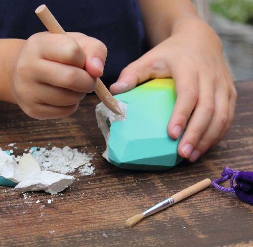 Zauber ausgraben – das Glück steckt im Stein! In jedem bunten Gips-Edelstein verbirgt sich ein schimmernder Glücksstein (Quarz), der mit dem beiliegenden Werkzeug selbst freigelegt werden kann. Einfach ausgraben, abpinseln und staunen! Das Set enthält alles, was man braucht: Meißel, Pinsel und ein samtweiches Beutelchen zum Aufbewahren oder Verschenken des Fundstücks. Ideal zum Sammeln, als kleines Geschenk – oder als Glücksbringer für die nächste Klassenarbeit, den Referatstag oder andere besondere Momente.