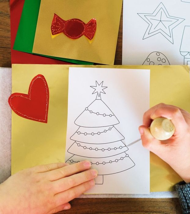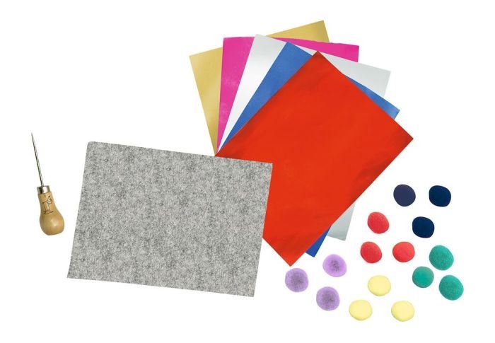 Inhalt: 1 Prickelnadel mit Holzgriff, 1 Prickelfilz, 10 winterliche Motivvorlagen, 10 Metallic-Papiere Schnur & Pompons zum Gestalten einer Girlande