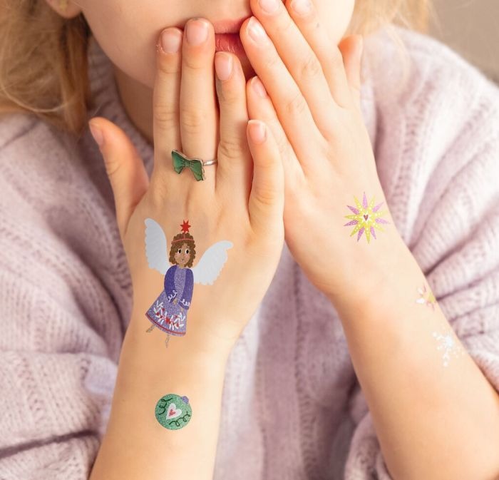 Metallic-Tattoos Weihnachtszauber – Festlicher Glanz für kleine Hautkunstwerke Diese schimmernden Metallic-Tattoos bringen magischen Weihnachtszauber auf Haut und Herz. Mit 24 detailverliebten Motiven wie Engel, Schneemann, Rentier und Lebkuchenfigur verwandeln sich Arme, Hände und Gesichter in funkelnde Winterkunst. Die Tattoos lassen sich ganz einfach mit Wasser auftragen, sind hautfreundlich und angenehm zu tragen – perfekt für Kinderfeste, Adventsfeiern oder einfach, um sich in festliche Stimmung zu bringen.