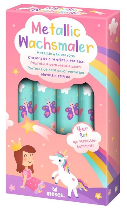 Zum Malen und Verzieren: Die Metallic-Wachsmaler Zauberschloss verleihen jedem selbstgemalten Bild und selbstgebastelten Geschenk das gewisse Etwas! Das Set besteht aus vier Stiften mit Metallic-Effekt und herausdrehbarer Wachsmine. Die Wachsmalstifte in fröhlichen Farben kommen in einer Verpackung in zauberhaft niedlichem Design, die das Set zu einem tollen Geschenk für den Kindergeburtstag oder für zwischendurch macht. Ein Muss für den Schreibtisch im Kinderzimmer von kleinen Künstler*innen!